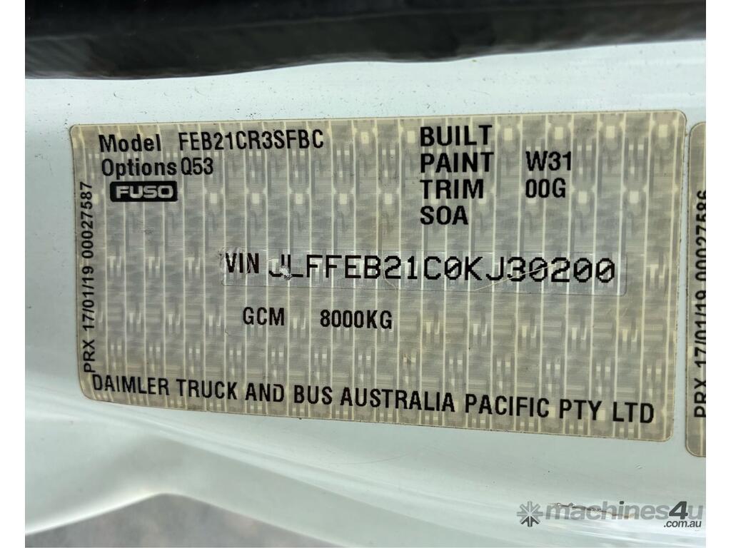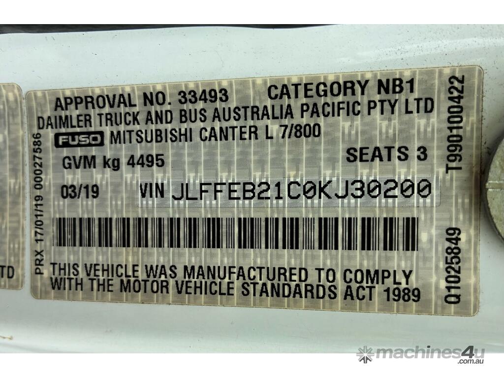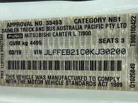 CP: 03/2019,Mitsubishi,Canter 515,Table Top,Automatic,Spring,4 Cyl,Diesel,200768 (Kms. Showing on Odometer),Hourmeter not visible,Colour: White,Rego. No: 768ZPW QLD,VIN: JLFFEB21C0KJ30200,Key No: 255,GVM: 4495,GCM: 8000,Sold with No Plates,Key No: 255