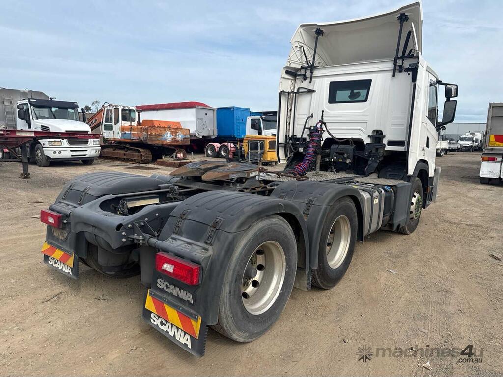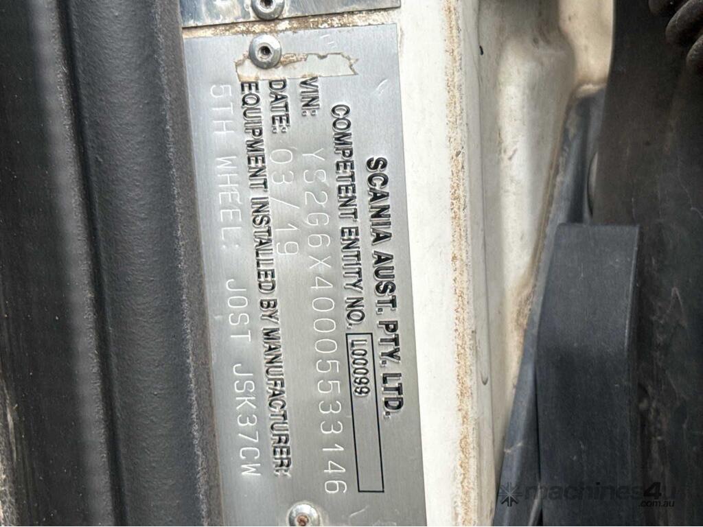 CP: 03/2019,Scania,G450,Prime Mover,Automatic,Airbag,6 Cyl,Diesel Turbo,760215 (Kms. Showing on Odometer),13855 (Hrs. Showing on Hour meter),Colour: White,Unregistered,VIN: YS2G6X6,Length: 6.9 m,GVM: 25900,GCM: 60000,Sold with No Plates