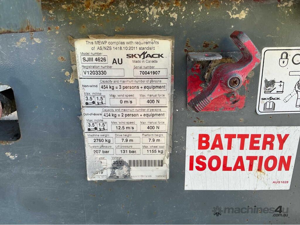 CP: CIRCA 2019,Skyjack,SJ1114626,Scissor Lift,Electric,Odometer not visible,195 (Hrs. Showing on Hour meter),Colour: Orange,Unregistered NSW,Serial No: 70041907,Sold with No Plates,Key No: 158E