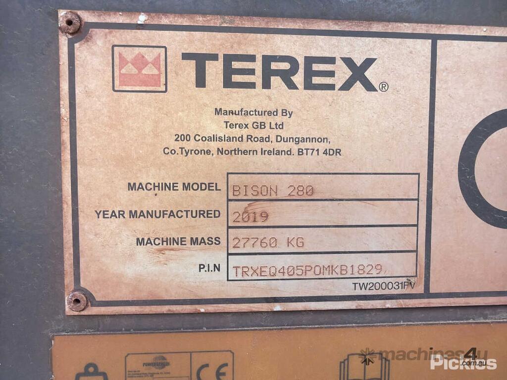 CP: CIRCA 2019,Terex,BISON 280,Jaw Crusher (Steel Tracked),4 Cyl,Diesel Turbo,Odometer not visible,1166 (Hrs. Showing on Hour meter),Colour: Green,Unregistered,Serial No: TRXEQ405P0MKB1829,Sold with No Plates