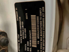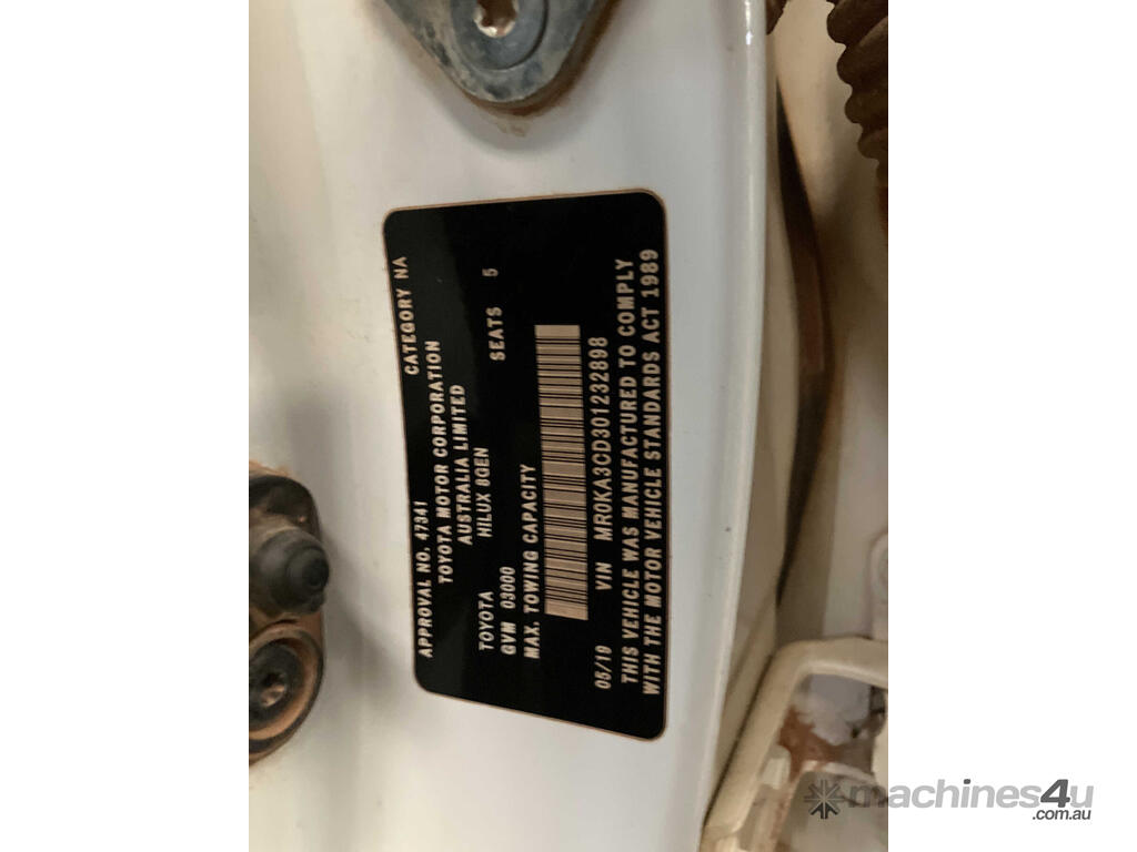 CP: 05/2019,Built: 04/2019,Toyota,Hilux,GUN126R SR,Cab Chassis Dual Cab,5 seats,4 doors,Sports Automatic,Engine #: 1GDA298287,2.8 Ltr,4 Cyl,Diesel,Direct Injection,6 Gears,253798 (Kms. Showing on Odometer),Colour: White,Rego. No: 1GVY502 WA,Rego expiry: 14/08/2026,VIN: MR0KA3CD,Trim: Cloth,Black,Sold with No Plates