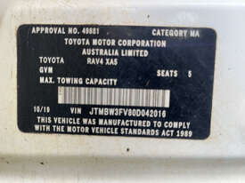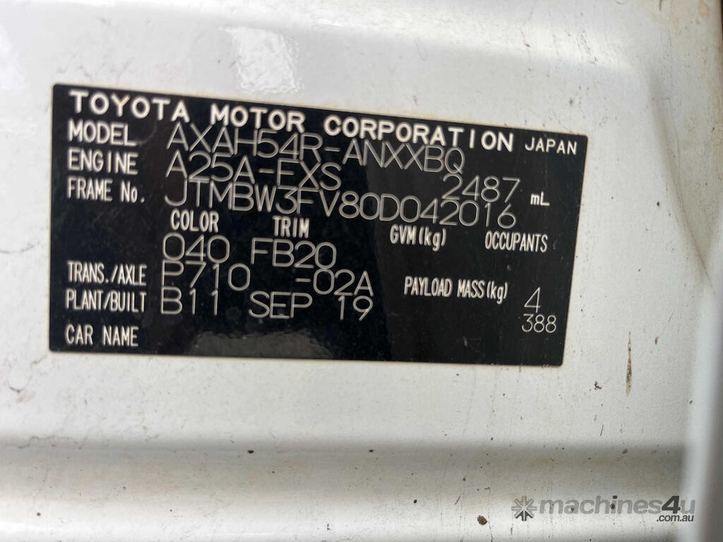 CP: 10/2019,Built: 09/2019,Toyota,RAV4,AXAH54R GX,Wagon,5 seats,5 doors,Constantly Variable Transmission,Engine #: A25AR235258,2.5 Ltr,4 Cyl,Petrol - Unleaded ULP,Direct & Multi-Point Injection,6 Gears,156134 (Kms. Showing on Odometer),Colour: White,Rego. No: NP(221ZHM), Unregistered QLD,VIN: JTMBW3FV80D042016,Trim: Cloth,Black / Grey,Sold with No Plates