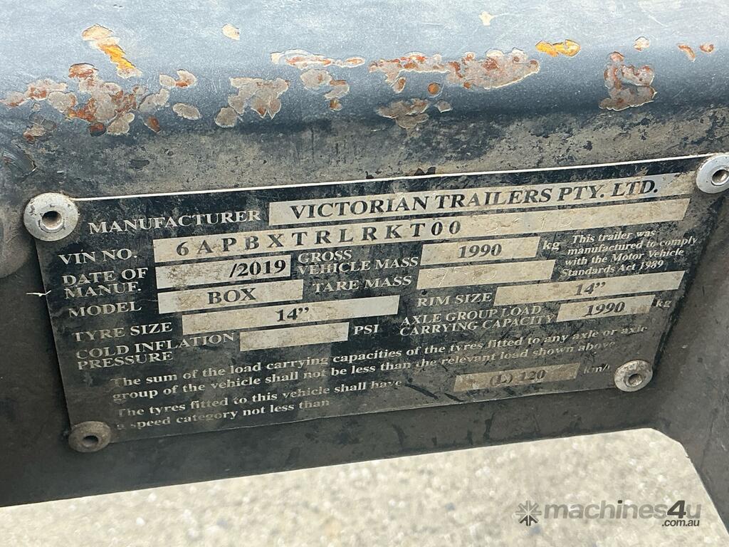 CP: 04/2019,Victorian Trailers,BOX,Tandem Axle Plant Trailer,Hubometer not visible,Colour: Black,Rego. No: NP(Z38045), Unregistered,VIN: 6APBXTRLRKT003015,Serial No: NULL,Sold with No Plates