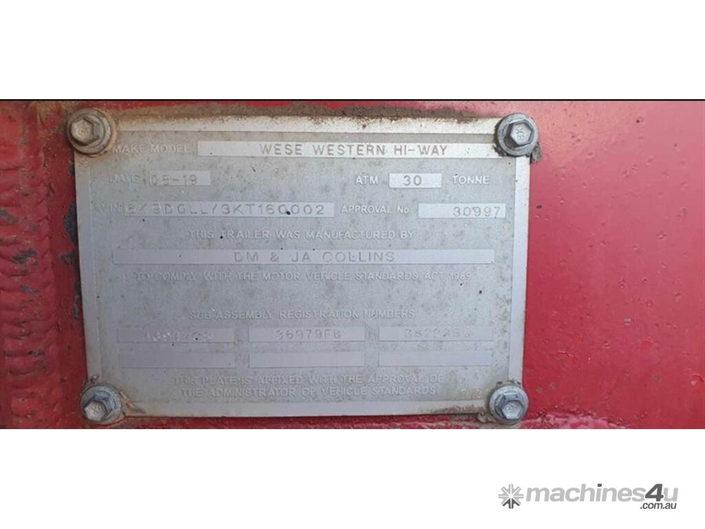 2019 WESE WESTERN HI-WAY TRI DOLLY. VIN 6K9DOLLY3KT160002. New draw bar bushes. Right weigh analogue guage. New eyelet pull. New lights and re-wired. Hydraulic line. Jost grealess turntable. Majority of tyres at 80%. 4 x tyres at 20%. Pin to pin measurement is 4150mm. Running the York axles on Hendrickson air bag suspension. Asset is currently registered, sold unregistered per auction T&C's. Located Pallamallawa, NSW