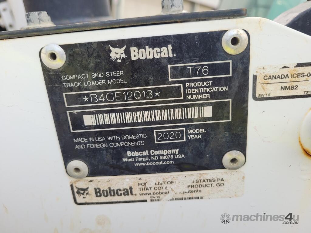 USED 2020 BOBCAT T76 SKID STEER LOADER (T446) WITH LOW 1210 HOURS IN GOOD CONDITION WITH C88 COMFORT PACKAGE, P69 PERFORMANCE PACKAGE, HI-FLOW AUXILIARY HYDRAULICS, RIDE CONTROL, WIDE SERIES RUBBER TRACKS, 4 IN 1 BUCKET, 75HP TURBO DIESEL, VERTICAL LIFT LOADER ARMS, FULL A/C PRESSURISED CABIN WITH ROPS, HYDRAULIC QUICK HITCH, PREMIUM CAB OPTIONS, 2 SPEED TRAVEL, REAR VIEW CAMERA, WORK LIGHTS, BT RADIO, UHF RADIO, BATTERY ISOLATOR, E-STOPS, JOYSTICK CONTROLS, 4650KG OPERATING WEIGHT AND RISK ASSESSMENT.