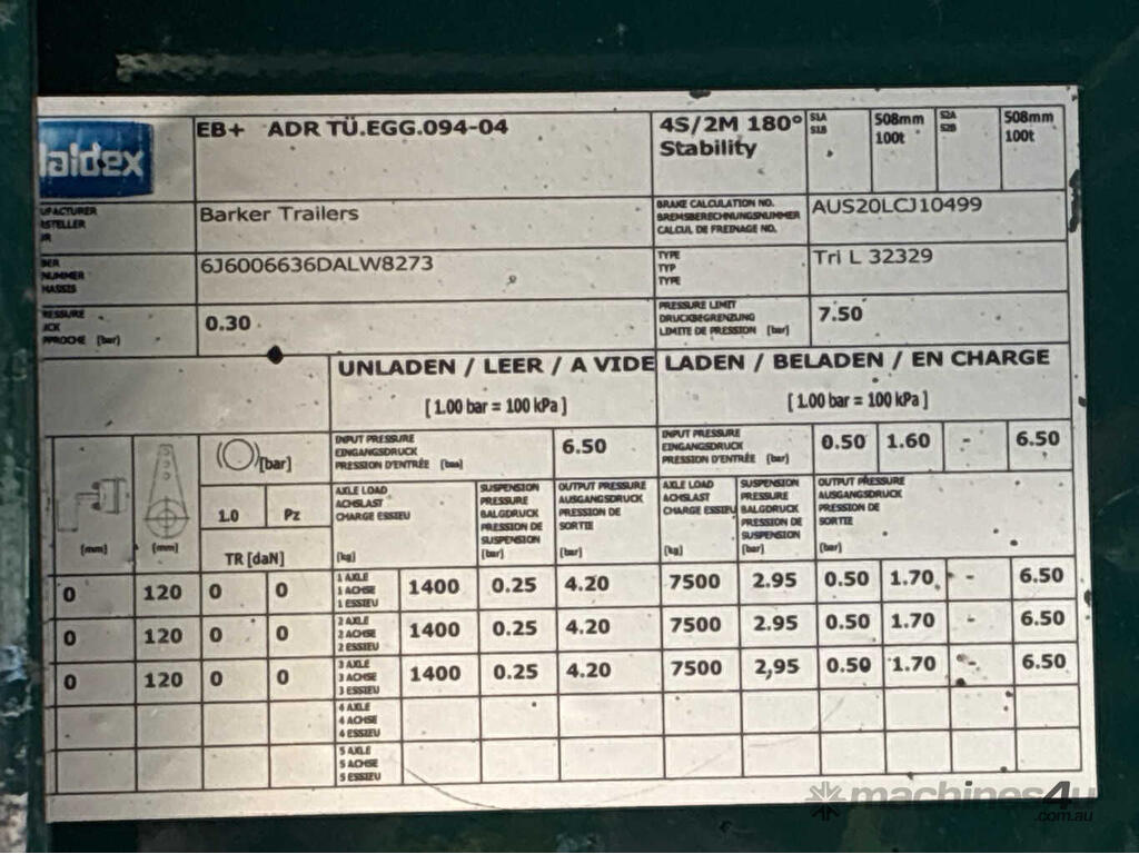 CP: 03/2020,Barker,Tri Axle Flat Top Curtainsider A Trailer,47852 (Kms. Showing on Hubometer),Colour: Green,Unregistered,VIN: 6J6006636DALW8273,Sold with No Plates