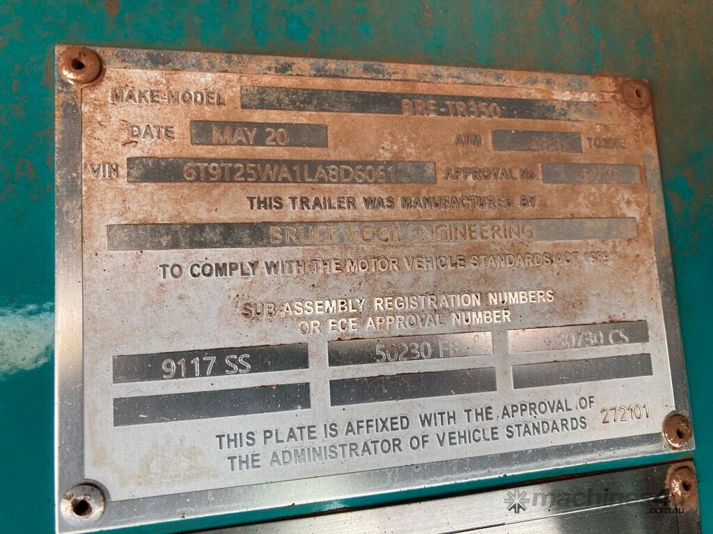 CP: 05/2020,Bruce Rock Engineering,BRE-TR350,Tri Axle Flat Top A Trailer,Colour: Green,Rego. No: NP(1TVF158), Unregistered WA,VIN: 6T9T25WA1LA8D6061,Sold with No Plates