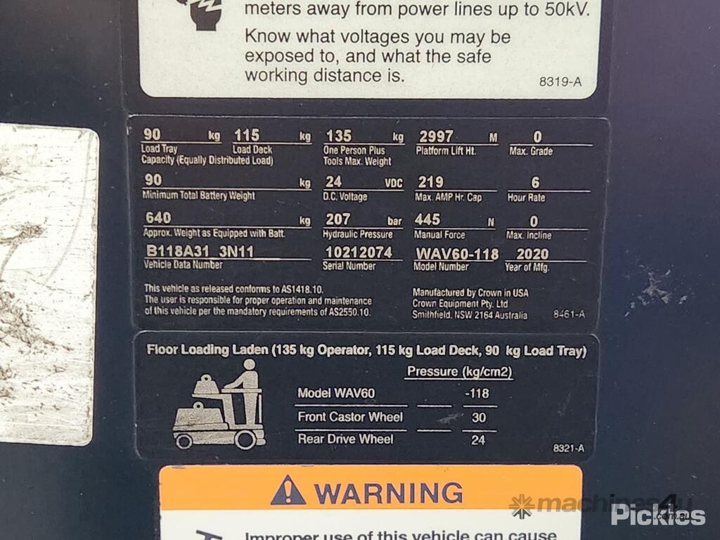 CP: CIRCA 2020,Crown,WAV60-118,Electric Reach Forklift (Stand on),Electric,Odometer not visible,1875 (Hrs. Showing on Hour meter),Unregistered,Serial No: 10212074,Sold with No Plates