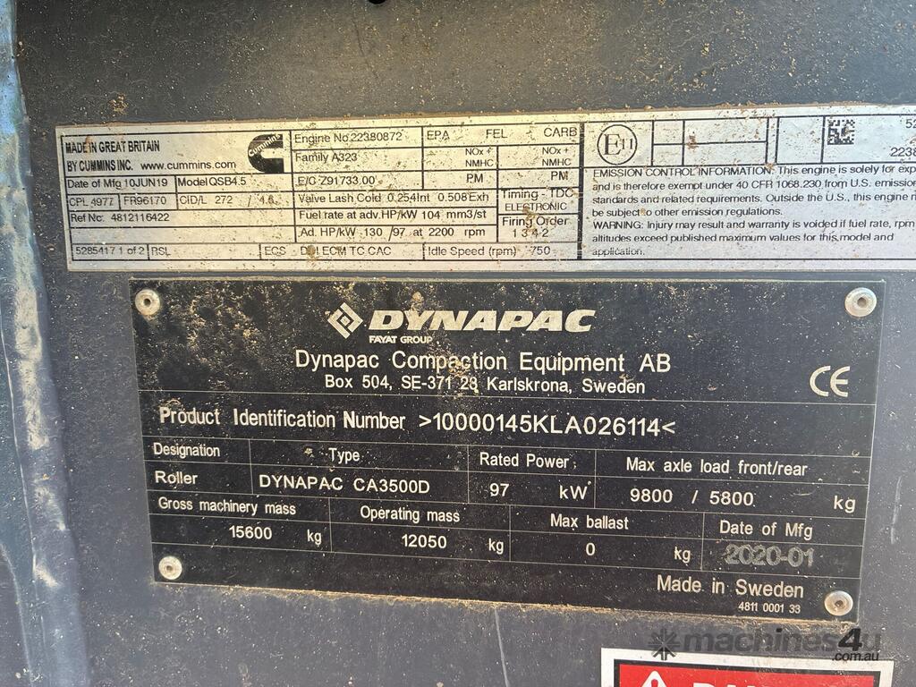 CP: 01/2020,Dynapac,CA3500D,Smooth Drum Roller,Diesel,Odometer not visible,4068 (Hrs. Showing on Hour meter),Colour: White,Rego. No: NP(XV88OA), Unregistered,Serial No: 10000145KLA026114,Sold with No Plates