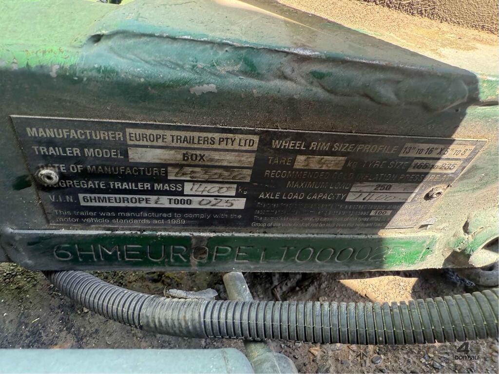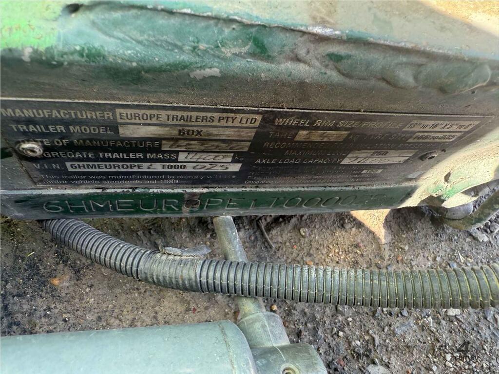 CP: CIRCA 2020,Europe Trailers,Box,Single Axle Trailer,0 (undefined),Colour: Green,Rego. No: NP(B23232), Unregistered VIC,VIN: 6HMEUR0PELT000025,Sold with No Plates,WOVR Status: Repairable Write-Off,Incident Type: Impact
