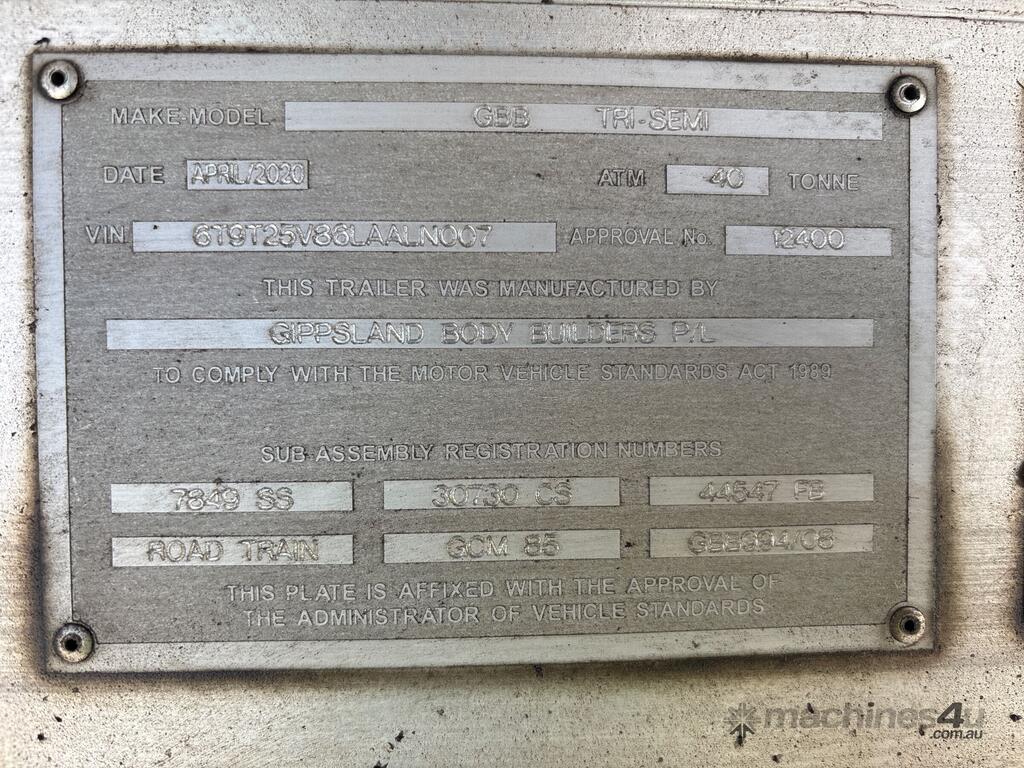 CP: 04/2020,Built: 05/2020,Gippsland Body Builders,Tri-semi,Tri Axle Dog Trailer,Hubometer not visible,Colour: Silver,Rego. No: NP(YV72IF), Unregistered NAT,VIN: 6T9T25V86LAALN007,Sold with No Plates,WOVR Status: WOVR N/A,Incident Type: Impact