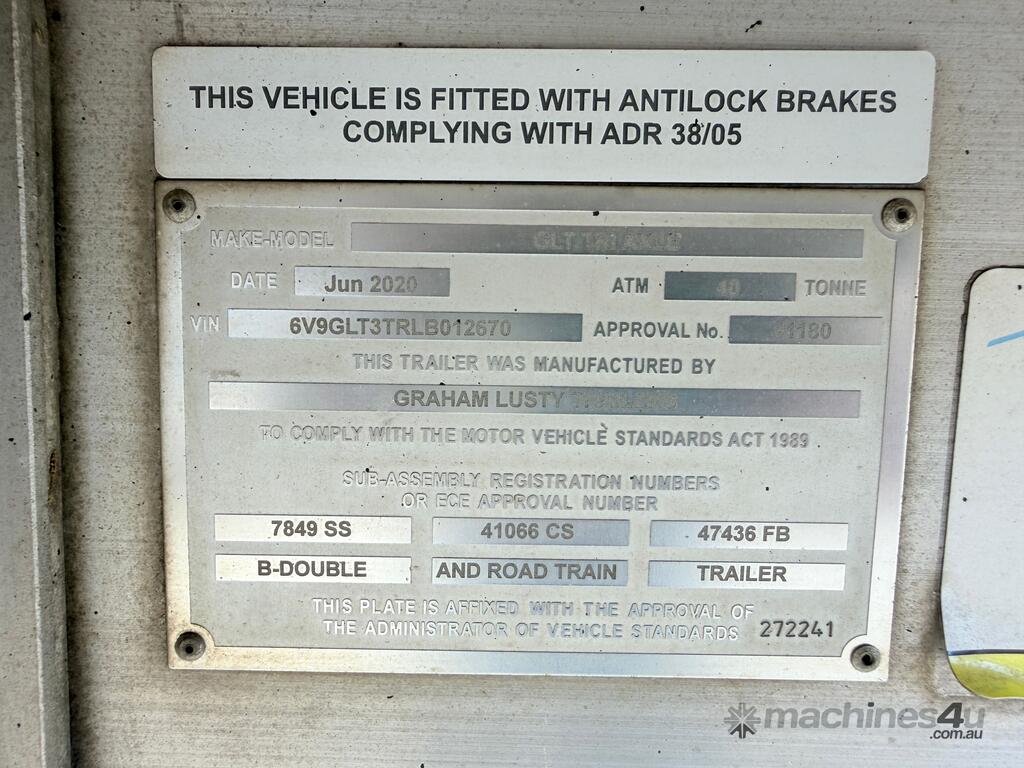 CP: 06/2020,Graham Lusty Trailers,GLT Triaxle,Tri Axle Tipping B Trailer,0 (undefined),Colour: Alloy,Unregistered,VIN: 6V9GLT3TRLB012670,Sold with No Plates
