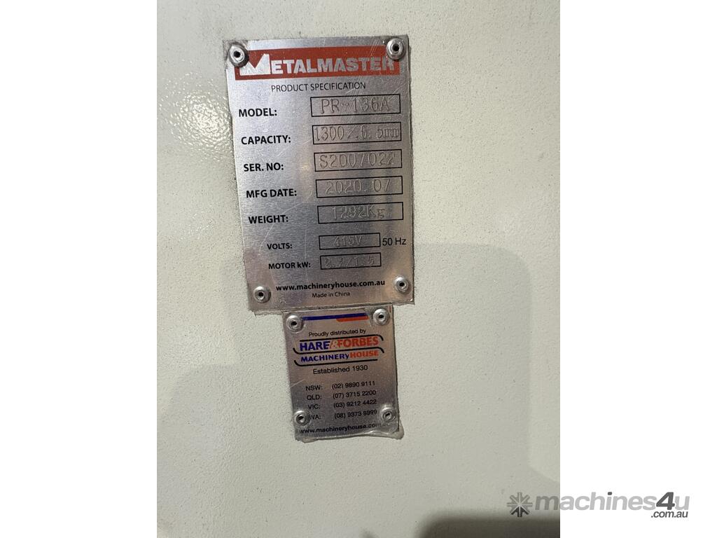 2020 Hare & Forbes Metalmaster Motorised Plate Curving Roller, Model: PR 136A, Capacity: 1300 x 6.5mm, 3 Phase Power, Foot Pedal Operation Controls. ,Inspection Recommended, See Photos For More Details. A Buyers Premium of 13.2% (GST Inc) Will Be Applied.