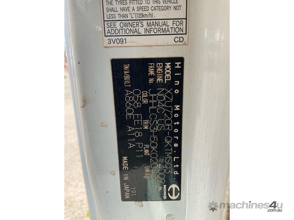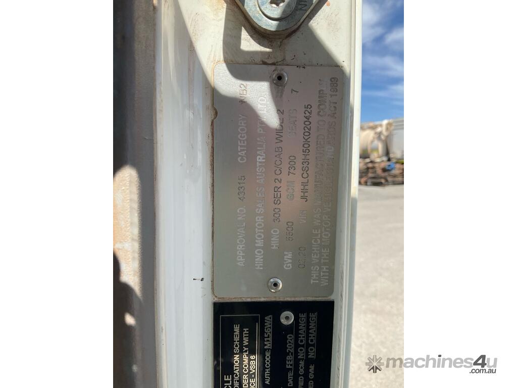 CP: 02/2020,Hino,300 616 ,Dual Cab Table Top,Automatic,Leaf,N04C US,4 Cyl,Diesel Turbo,104816 (Kms. Showing on Odometer),Hourmeter not visible,Colour: White,Rego. No: NP(1HTP828), Unregistered WA,VIN: JHHLCS3H50K020425,Key No: 70,GVM: 5500,GCM: 7300,Sold with No Plates,Key No: 70