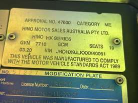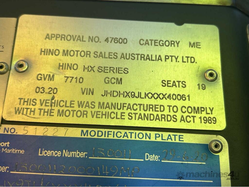 CP: 03/2020,Hino,Poncho,Bus,Automatic,Airbag Suspension,Engine #: J05ETS11499,Hino J05E,4 Cyl,Diesel,Turbo,77053 (Kms. Showing on Odometer),Hourmeter not visible,Colour: White,Rego. No: NP(217492), Unregistered ACT,VIN: JHDHX9JLKXXX40061,Key No: 11,Length: 4.6 m,GVM: 7710,Sold with No Plates,Key No: 11