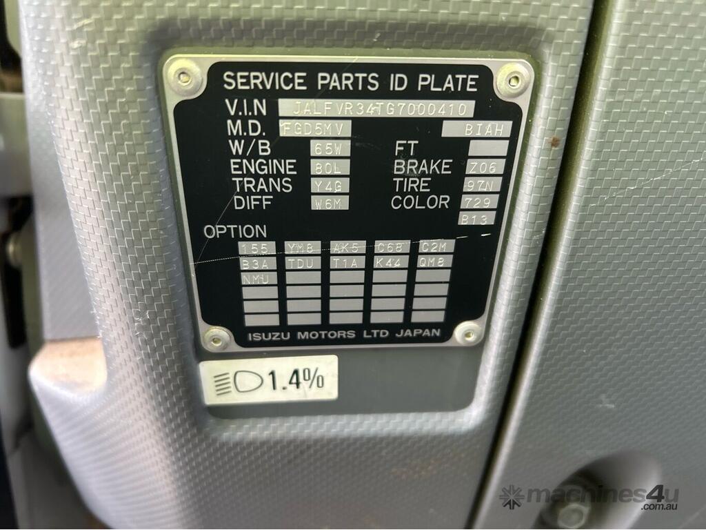 CP: 01/2020,Isuzu,FVD 165 300,Crane Tipper,Automatic,Air Bag Suspension ,Engine #: 214466,Isuzu 6HK1,6 Cyl,Diesel,Turbo,65699 (Kms. Showing on Odometer),4602 (Hrs. Showing on Hour meter),Colour: White,Rego. No: NP(217487), Unregistered ACT,VIN: JALFVR34TG7000410,Key No: 15,Length: 9.8 m,GVM: 16500,GCM: 32000,Sold with No Plates,Key No: 15
