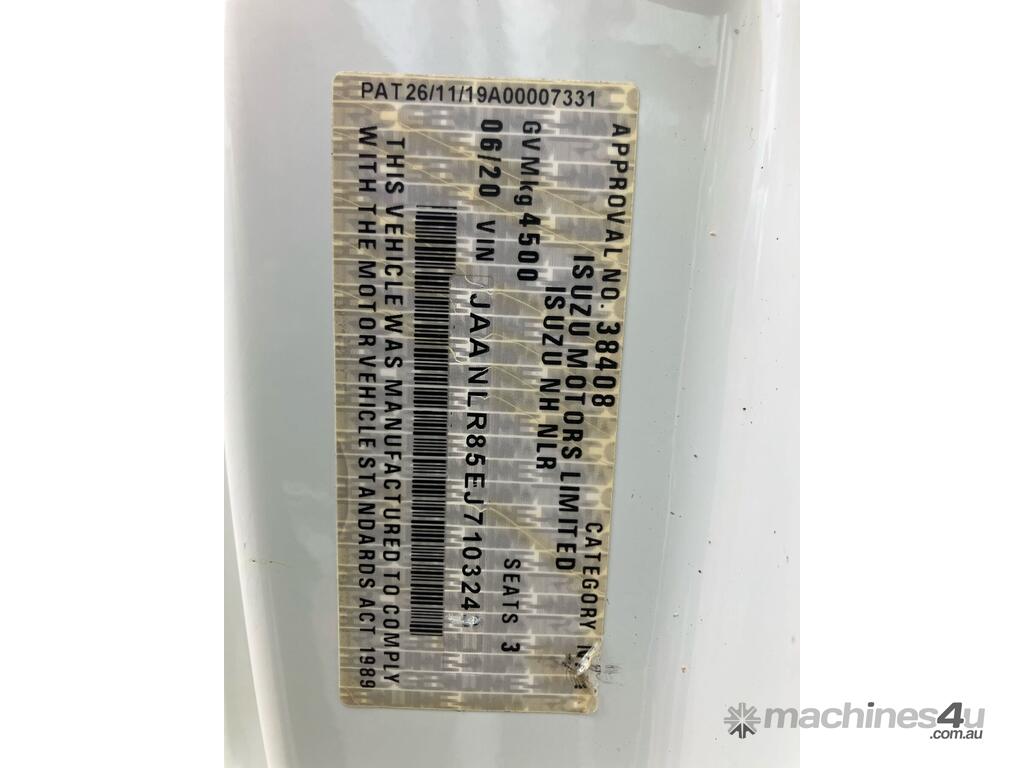 CP: 06/2020,Isuzu,NLR,Traypack,Manual,Leaf Springs,4 Cyl,Diesel,Turbo,5 Gears,155778 (Kms. Showing on Odometer),Hourmeter not visible,Colour: White,Rego. No: NP(CX92JI), Unregistered NSW,VIN: JAANLR85EJ7103243,GVM: 4500,GCM: 8000,Sold with No Plates