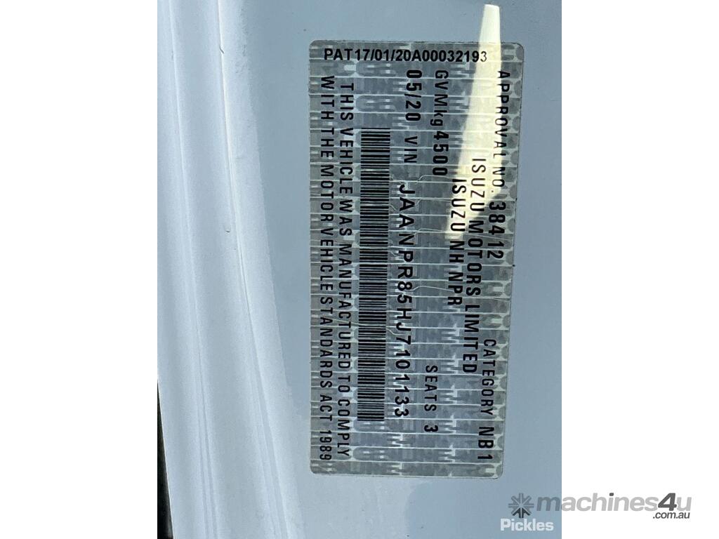 CP: 05/2020,Isuzu,NNR 45-150,Curtainsider,Automatic & Manual Mode,Leaf Spring Suspension ,4 Cyl,Diesel Turbo,134586 (Kms. Showing on Odometer),Hourmeter not visible,Colour: White,Rego. No: NP(1HCR958), Unregistered WA,VIN: JAANPR85HJ7101133,Key No: 170,GVM: 4500,GCM: 8000,Sold with No Plates,Key No: 170