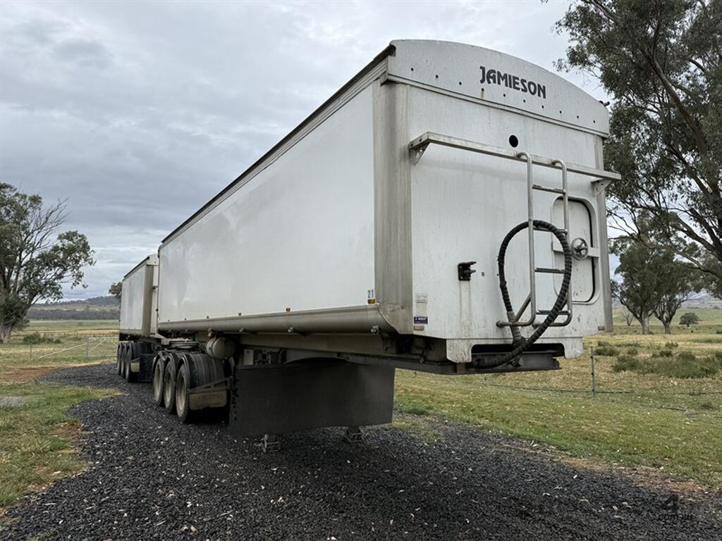 2020 JAMIESON/BOOMER STAG TIPPERS. VIN 6W9339800MA032542 and 6W9339900MA032543. One owner purchased new. Trailers are PBS approved with the current prime mover combination. SAF axles and air. Bluetooth right weigh scales. 10 stud rims. 1800mm sides. Current NSW registration to January 2026, will be sold unregistered per the auction terms and conditions. Drum brakes with auto slack adjusters. Sapre tyres. Roll over tarps, not razor tarps. Clean skin tyres. Hub metres showing 426,071kms and 450,031kms. 2 posi