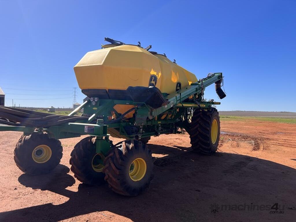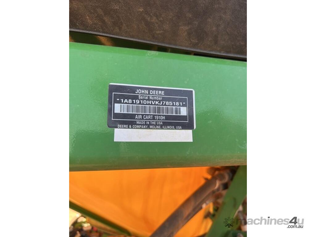 2020 John Deere 1910 550 bushel, 19,500L TBH air cart, 3 Tank, Single Fan, Ausplow Air heater fitted, 63mm 8 run d/shoot with section control. 12 inch wireless controlled conveyor, Dual front caster 21.5l 16 Tyres, 800/70R38 Rear tyres in good condition 80%