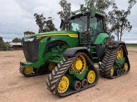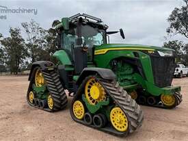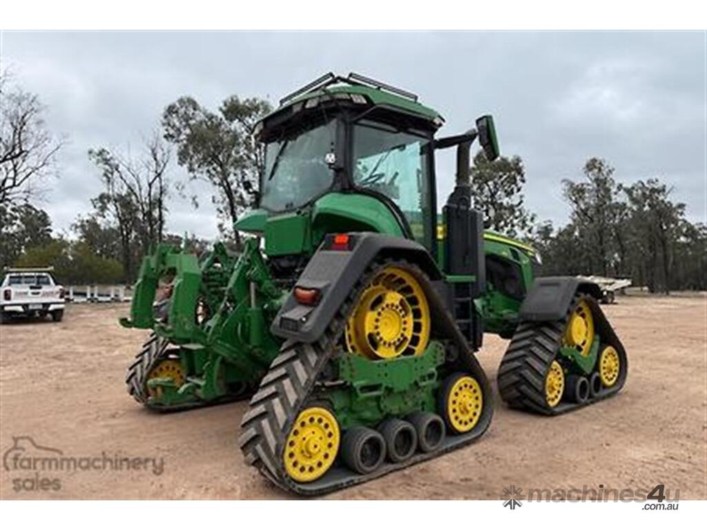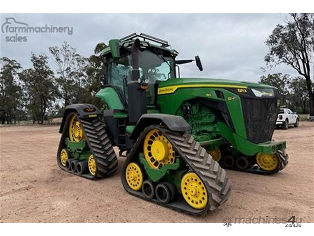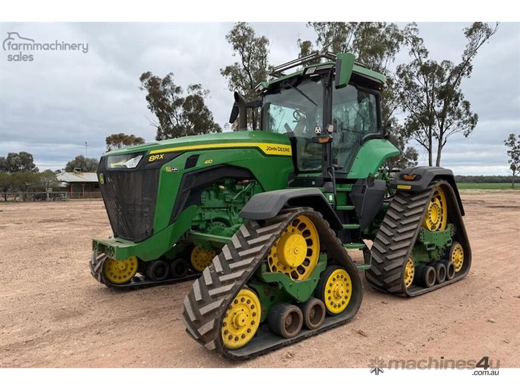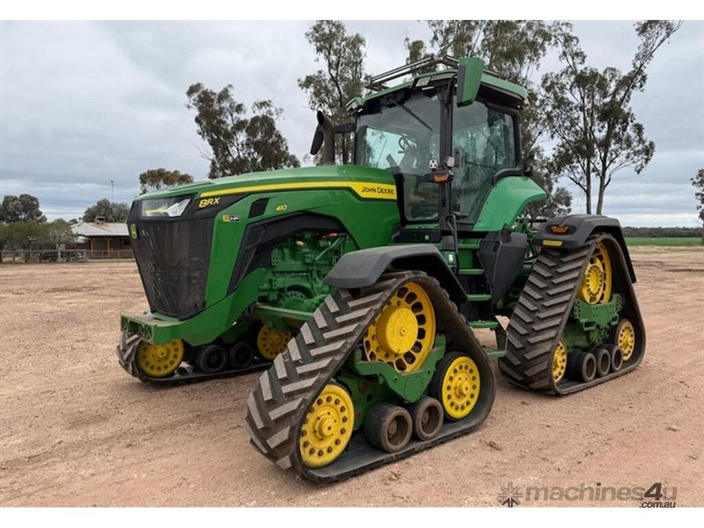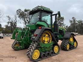 2020 John Deere 8RX 410 Tractor. 3,700hrs, Powershift, 24" Tracks front and rear, excellent condition, 3m track centres, complete with JD steering, integrated Starfire 6000, RTK unlocked, 3 point linkage, 5 hydraulic rear remotes, 410HP, Extra lights fitted to roof, Last sericed at 3,340hrs. Located Goondiwindi, QLD. Available at MRE Auctions.