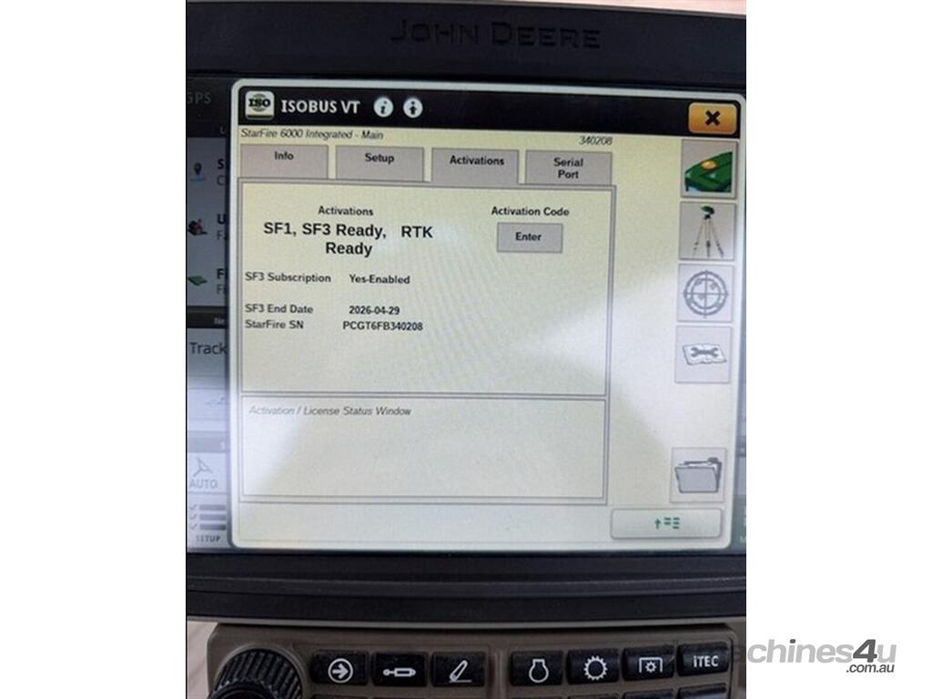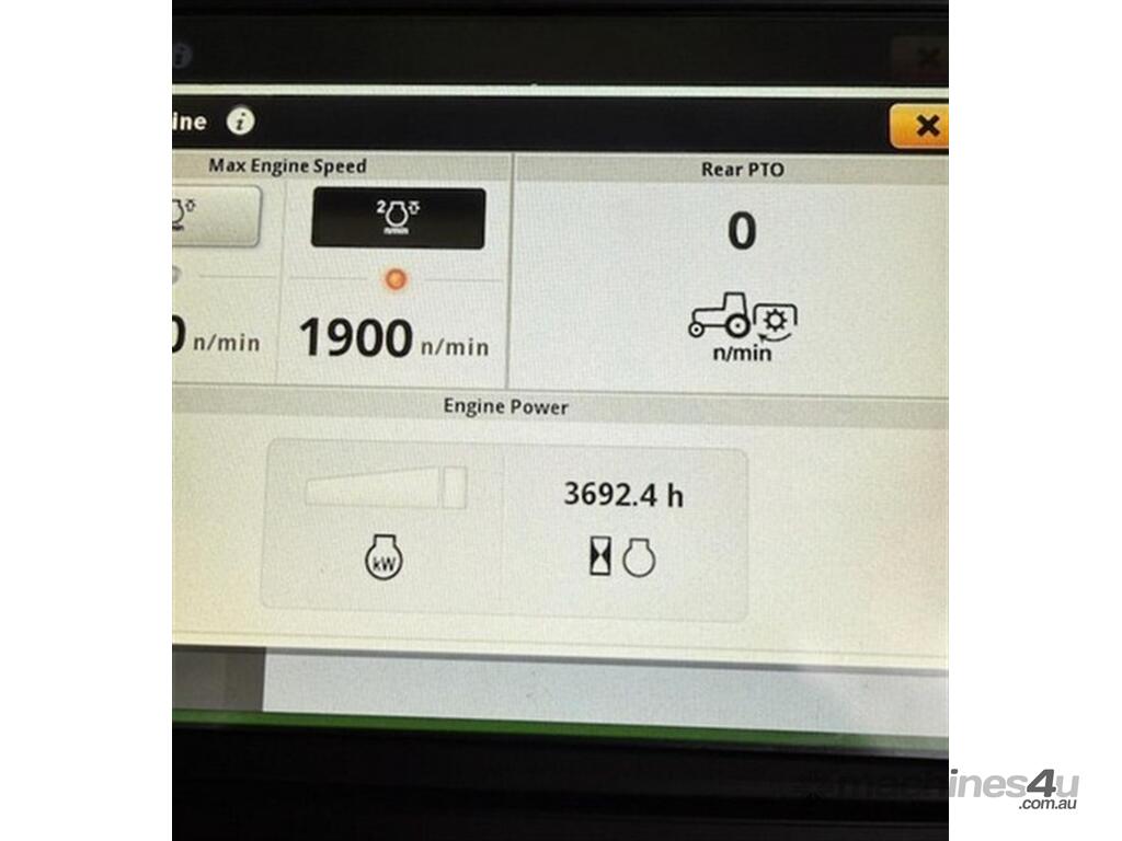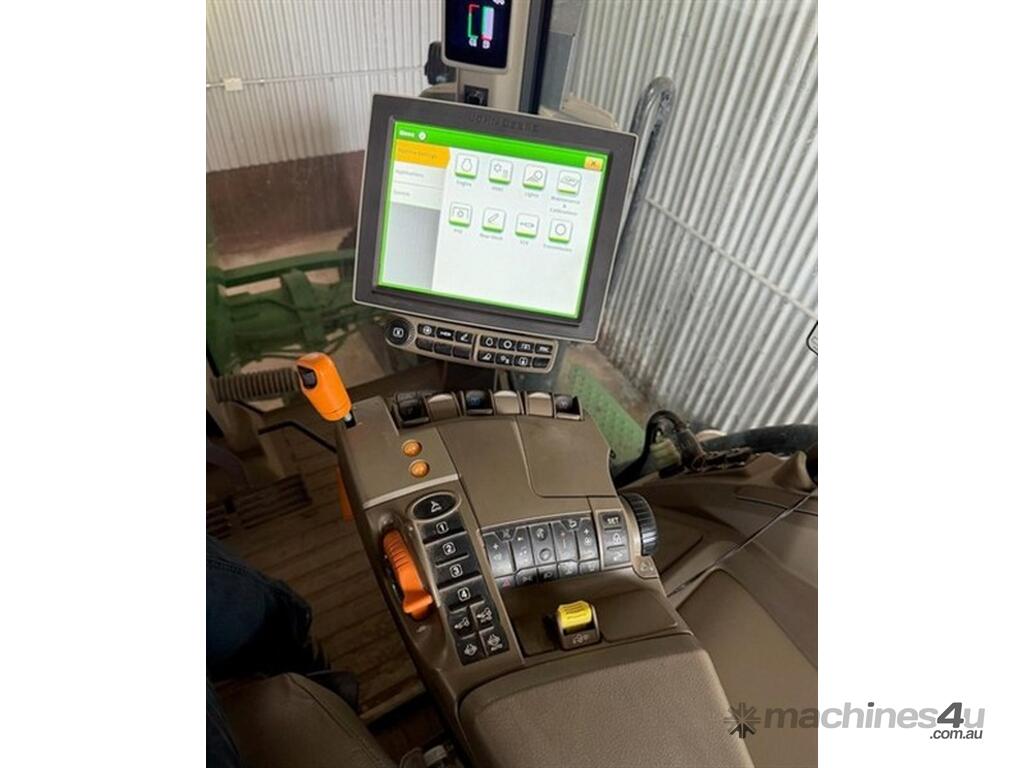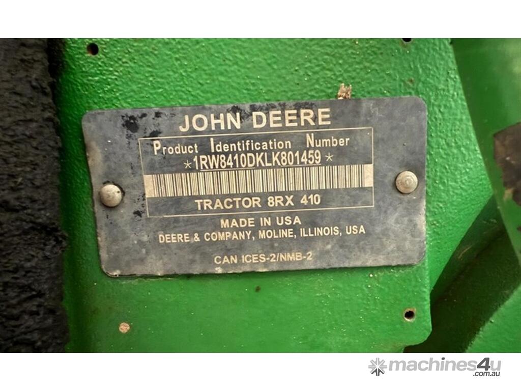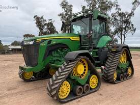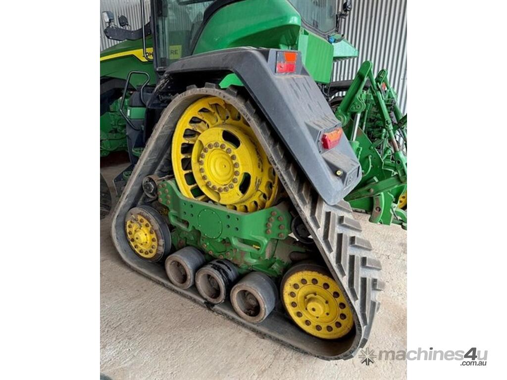 2020 John Deere 8RX 410 Tractor. 3,700hrs, Powershift, 24" Tracks front and rear, excellent condition, 3m track centres, complete with JD steering, integrated Starfire 6000, RTK unlocked, 3 point linkage, 5 hydraulic rear remotes, 410HP, Extra lights fitted to roof, Last sericed at 3,340hrs. Located Goondiwindi, QLD. Available at MRE Auctions.