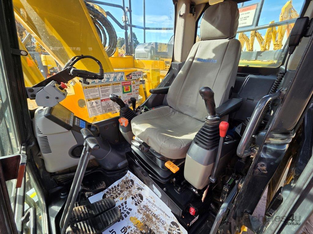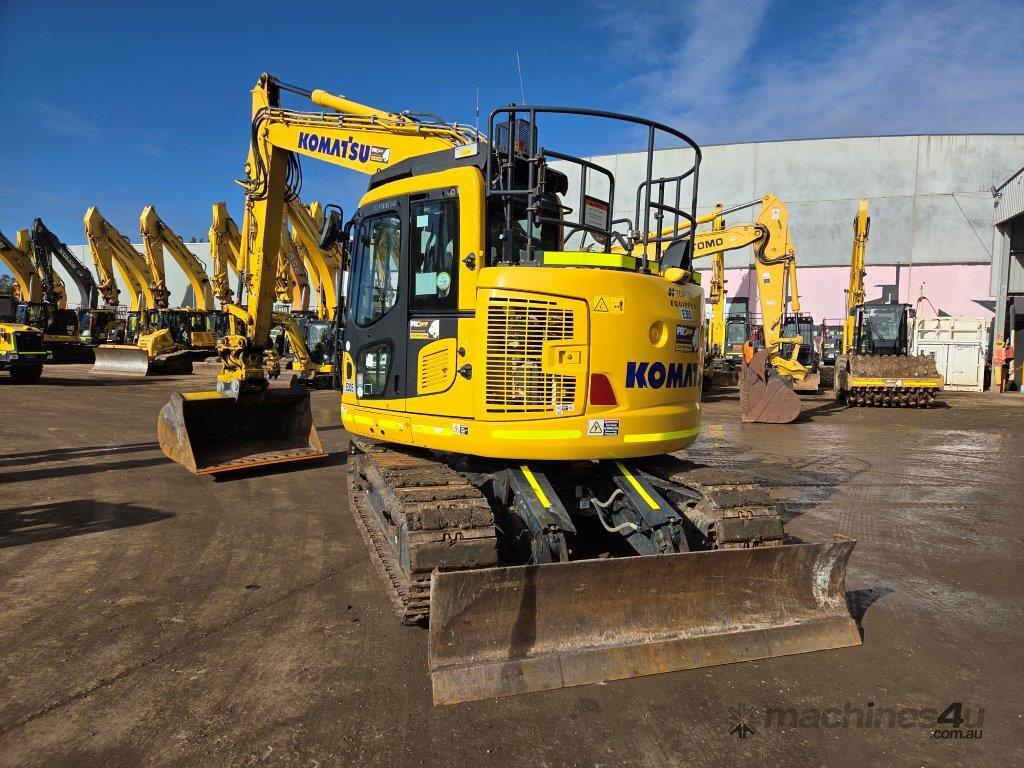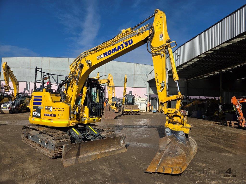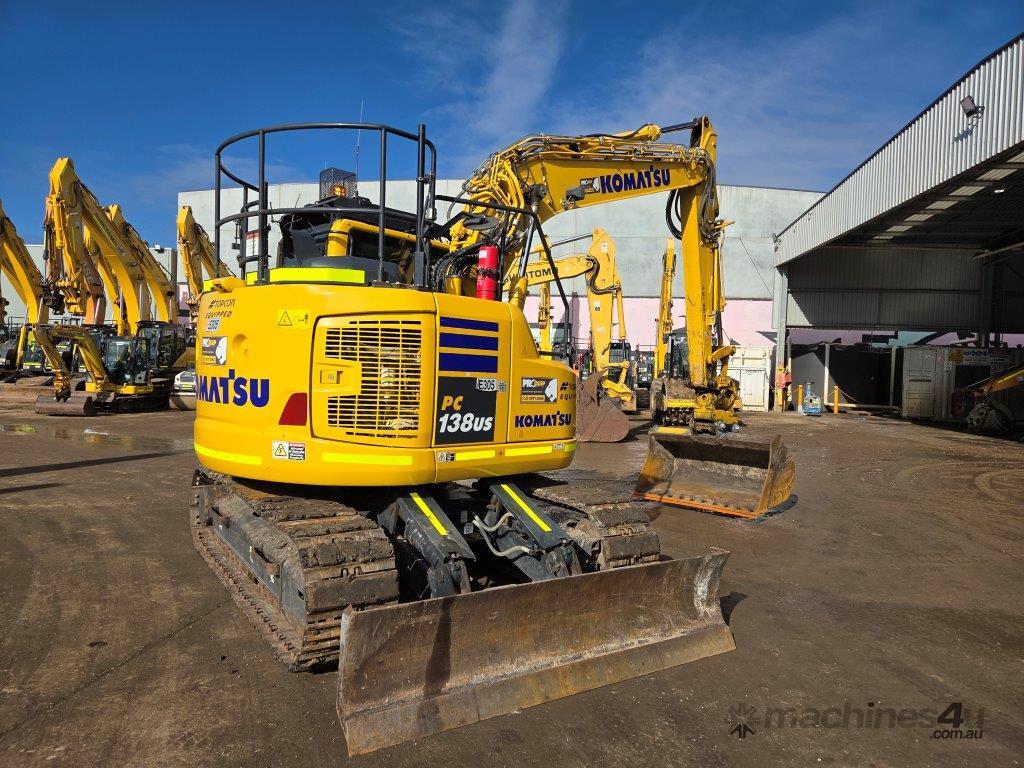USED 2020 KOMATSU PC138US-11 15T EXCAVATOR (E305) WITH REDUCED RADIUS TAIL, 3400 HOURS HRS, DOZER BLADE, STEEL TRACKS WITH PADS, TILTING HYDRAULIC HITCH, TOPCON GPS WIRING ONLY, FULL A/C CABIN WITH ROPS, TWO WAY FLOW AUXILIARY HYDRAULICS, REAR VIEW CAMERA, SAFETY HANDRAILS, CHECK VALVES, UHF RADIO, E-STOPS, FULL CIVIL SPEC, GP AND MUD BUCKET. ONE OWNER, FULL SERVICE HISTORY. RISK ASSESMENT, READY FOR WORK. AUSTRALIAN DELIVERED IN FEBRUARY 2021, BALANCE OF FACTORY WARRANTY;