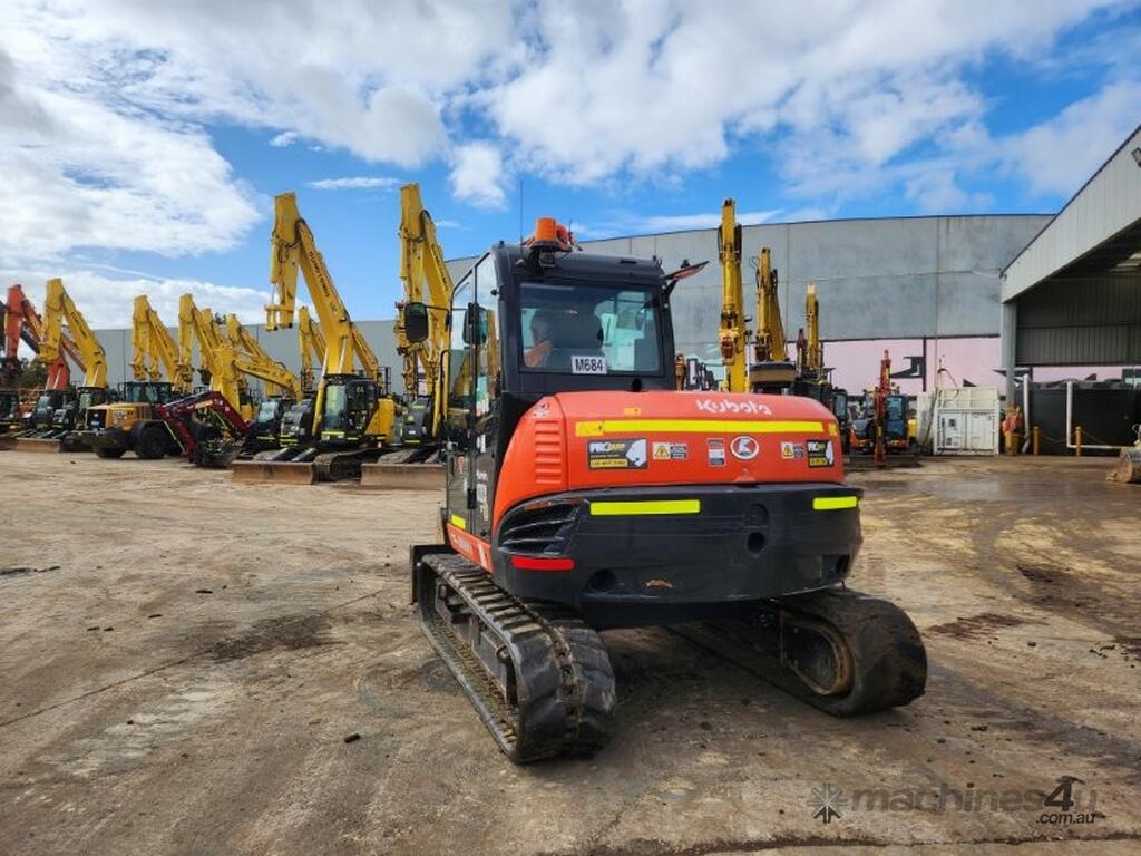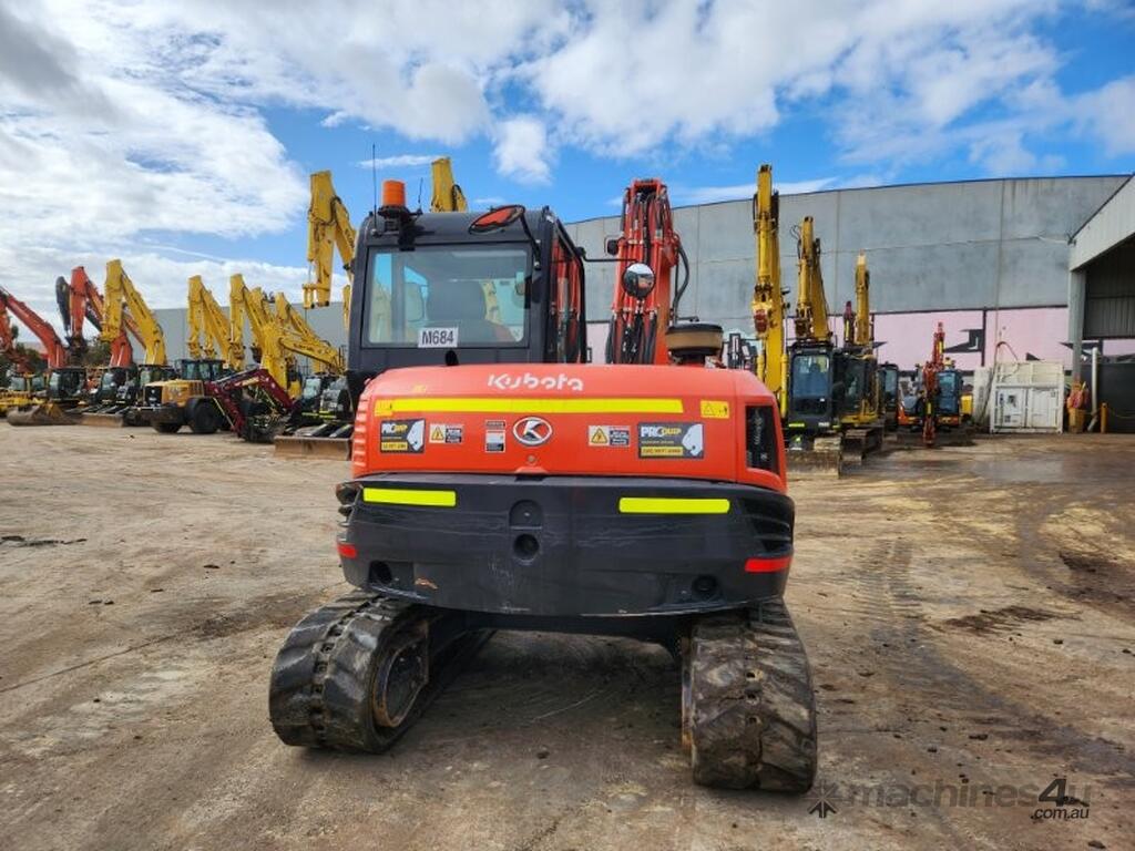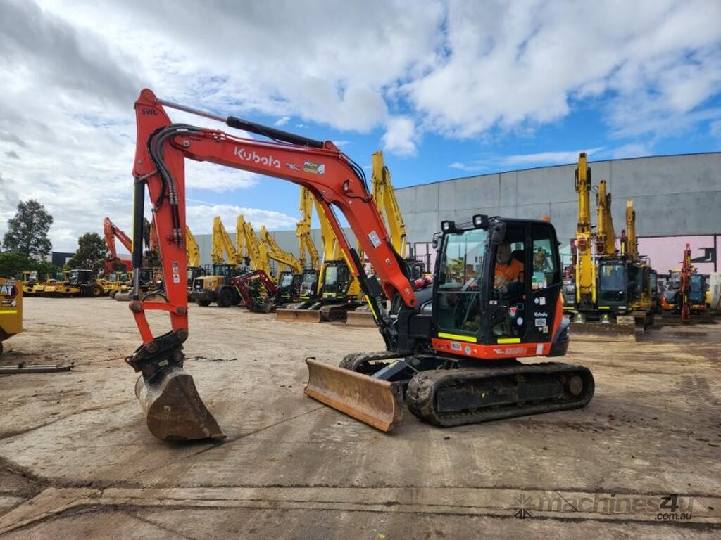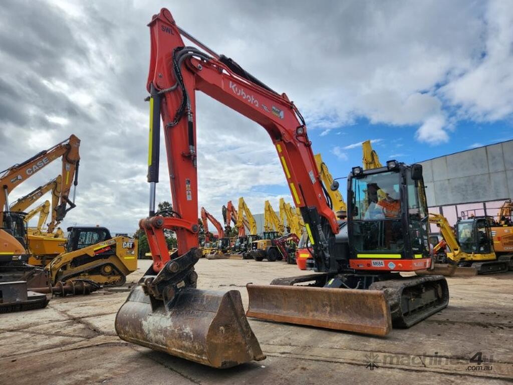 2020 KUBOTA KX080 8.2T EXCAVATOR (M684) WITH LOW 1450 HRS, FULL A/C CABIN, HEIGHT & SLEW RESTRICTION SAFETY SYSTEM, RUBBER TRACKS, SAFETY HYDRAULIC HITCH, 450 & 600mm DIG BUCKETS, MUD BUCKET, DOZER BLADE, HAMMER AND AUGER PIPING, SAFETY BEACON, REAR VIEW CAMERA, UHF RADIO, E-STOPS, RISK ASSESSMENT, AUSTRALIAN DELIVERED JANUARY 2021, ONE OWNER, FULL SERVICE HISTORY, 3-MONTH DRIVETRAIN WARRANTY. READY FOR WORK.