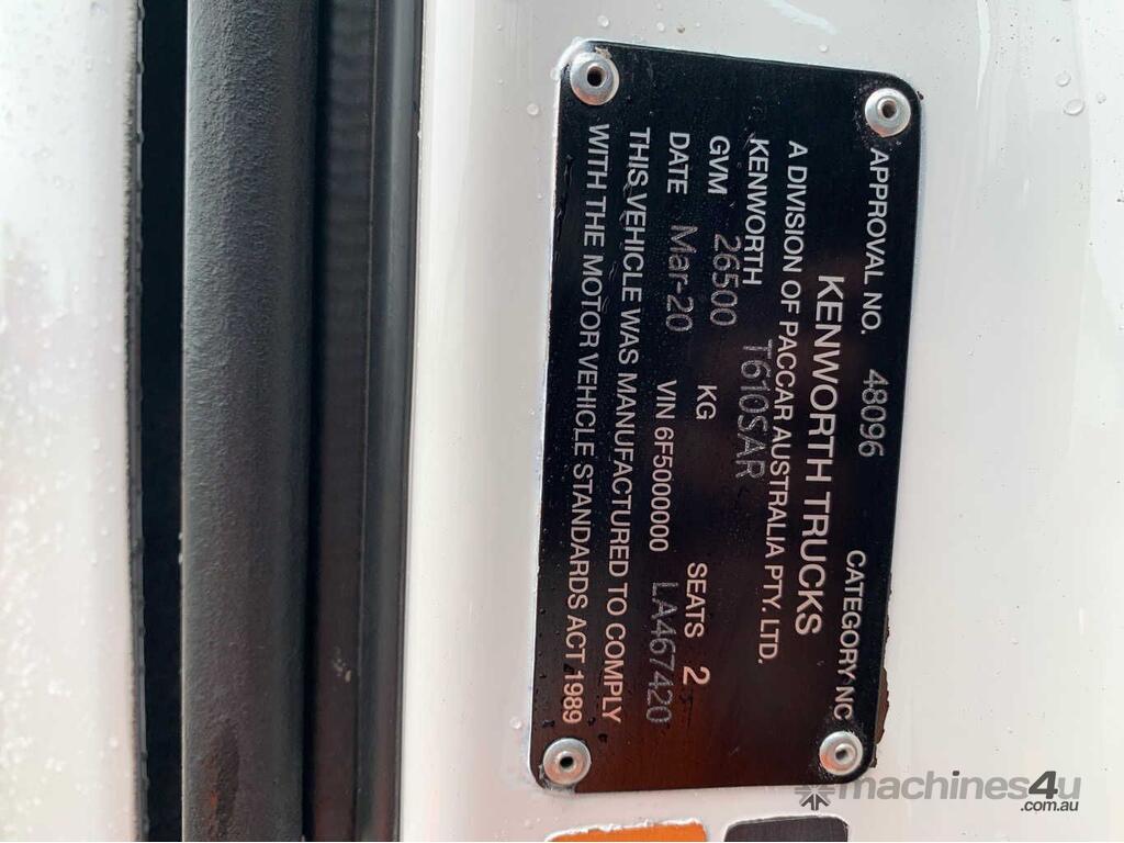 CP: 03/2020,Built: 03/2020,Kenworth,T610SAR,Prime Mover Day Cab,Manual,Airbag Suspension,Engine #: 80222416,Cummins X15.,6 Cyl,Diesel,Intercooler Turbo,18 Gears,1338182 (Kms. Showing on Odometer),22820 (Hrs. Showing on Hour meter),Colour: White,Rego. No: NP(ECC102), Unregistered QLD,VIN: 6F5000000LA467420,GVM: 26500,GCM: 97000,Sold with No Plates