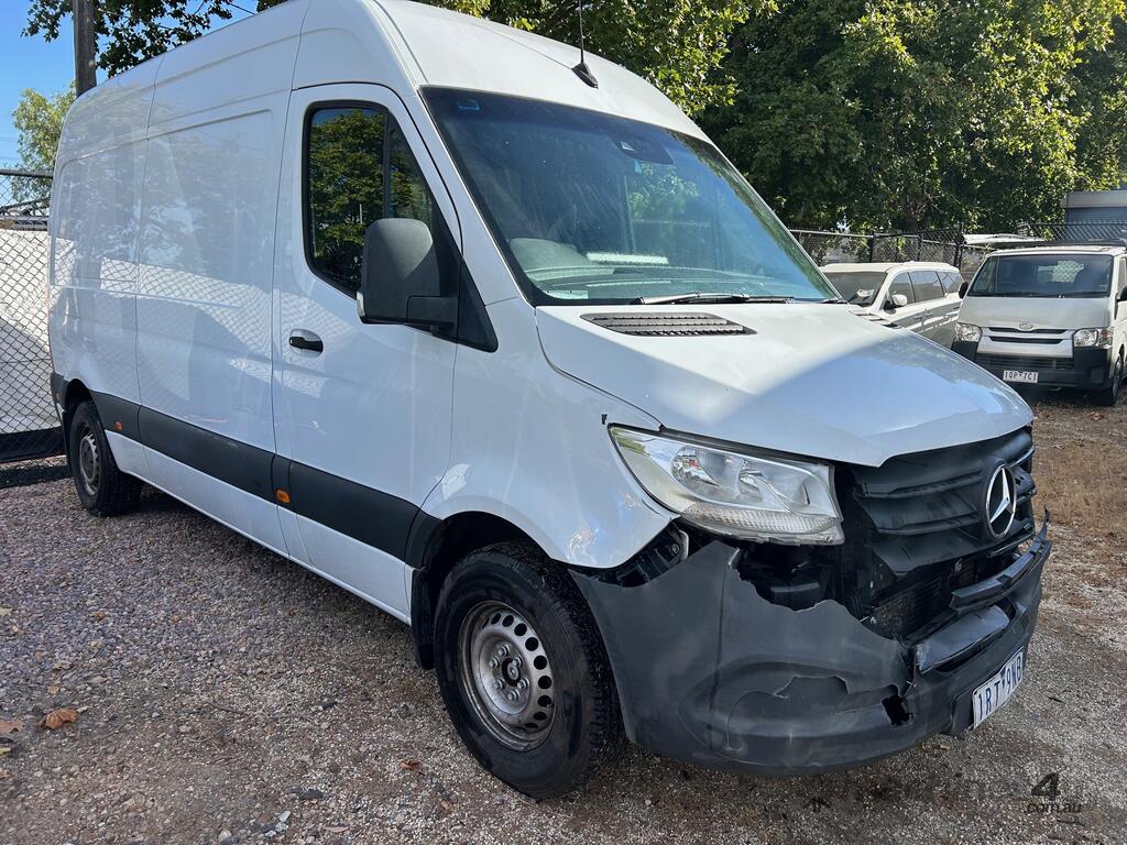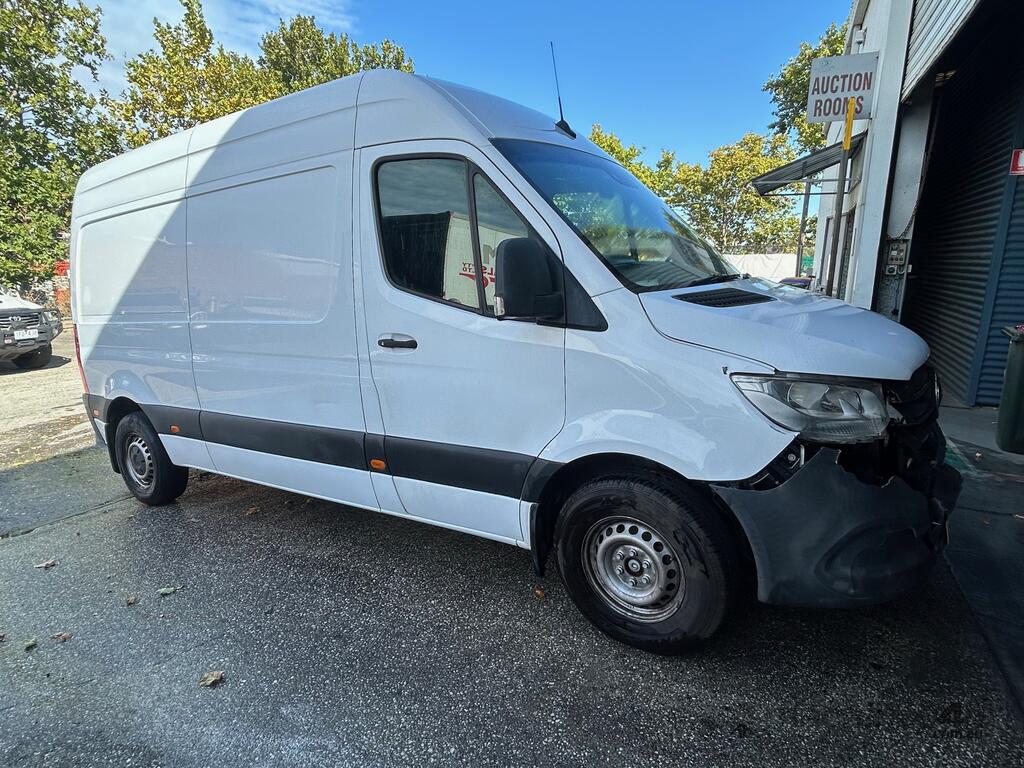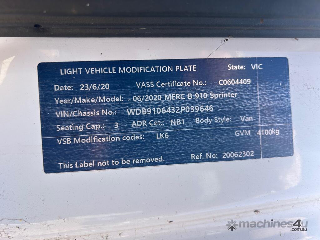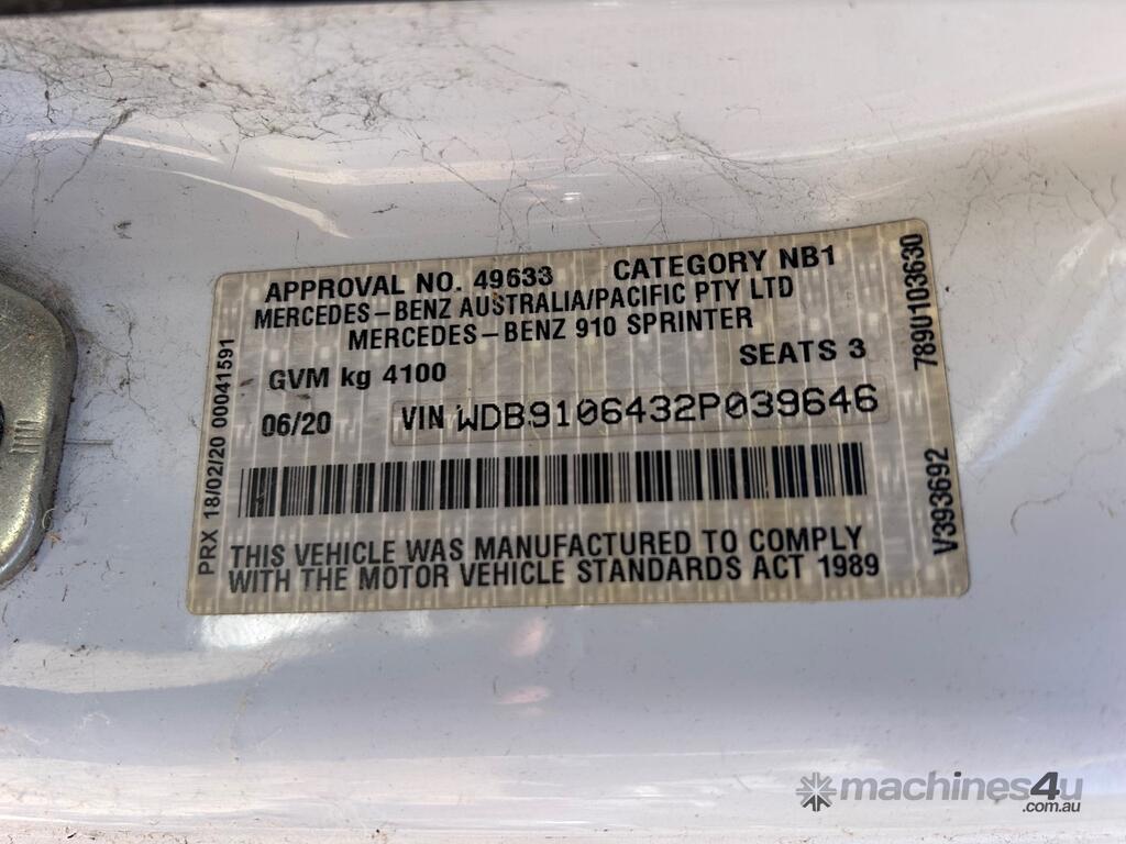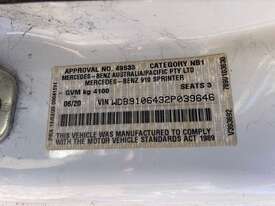6/2020 Mercedes Benz 910 (414 CDI) high roof long wheelbase Sprinter 3-seater van, powered by a 4 cylinder 2.1lt diesel engine, automatic transmission, full electrics, media centre, reverse camera, A/C, 1 x key, owners' books, tow attachment.