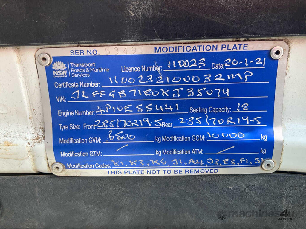 CP: 12/2020,Mitsubishi Fuso,Canter,4x4 Offroad Tour Bus,Manual,Spring,Engine #: 4P10E55441,4 Cyl,Diesel Turbo,5 Gears,67080 (Kms. Showing on Odometer),Hourmeter not visible,Colour: White,Rego. No: XN05YF NSW,Rego expiry: 12/04/2026,VIN: JLFFGB71E0KJ35079,Key No: 543S,Length: 6.6 m,GVM: 6500,GCM: 10000,Sold with No Plates,Key No: 543S