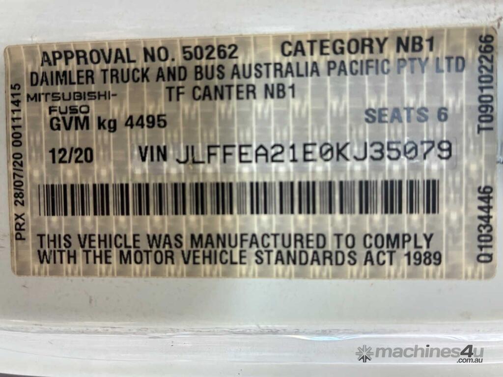 CP: 12/2020,Mitsubishi Fuso,Canter 515,Crew Cab Table Top,Automatic,Spring,4 Cyl,Diesel,87879 (Kms. Showing on Odometer),Hourmeter not visible,Colour: White,Rego. No: QGRN10 QLD,VIN: JLFFEA21E0KJ35079,Key No: 87,GVM: 4495,GCM: 7995,Sold with No Plates,Key No: 87