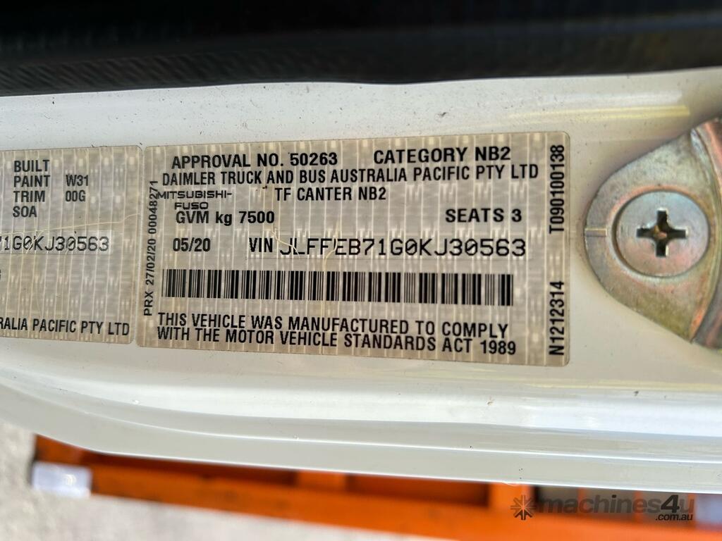 CP: 05/2020,Mitsubishi Fuso,Canter 815,Table Top,Manual,Spring,4 Cyl,Diesel,5 Gears,148703 (Kms. Showing on Odometer),Hourmeter not visible,Colour: White,Rego. No: XN18RV NAT,VIN: JLFFEB71G0KJ30563,Key No: 240,GVM: 7500,GCM: 11000,Sold with No Plates,Key No: 240