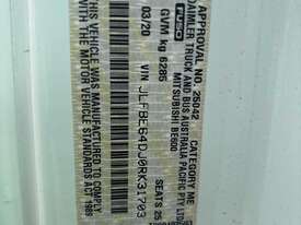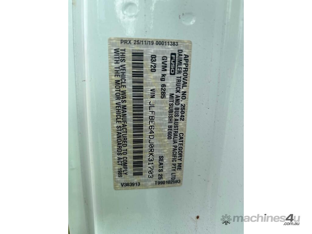 CP: 03/2020,Mitsubishi Fuso,Rosa BE600,Bus,Automatic,Leaf Spring Suspension ,Engine #: 4M50E30826,Mitsubishi Fuso 4M50,4 Cyl,Diesel Turbo,19000 (Kms. Showing on Odometer),Hourmeter not visible,Colour: White,Rego. No: NP(G07CD), Unregistered TAS,VIN: JLFBE64DJ0RK31703,Length: 7.7 undefined,GVM: 6285,GCM: 7900,Sold with No Plates