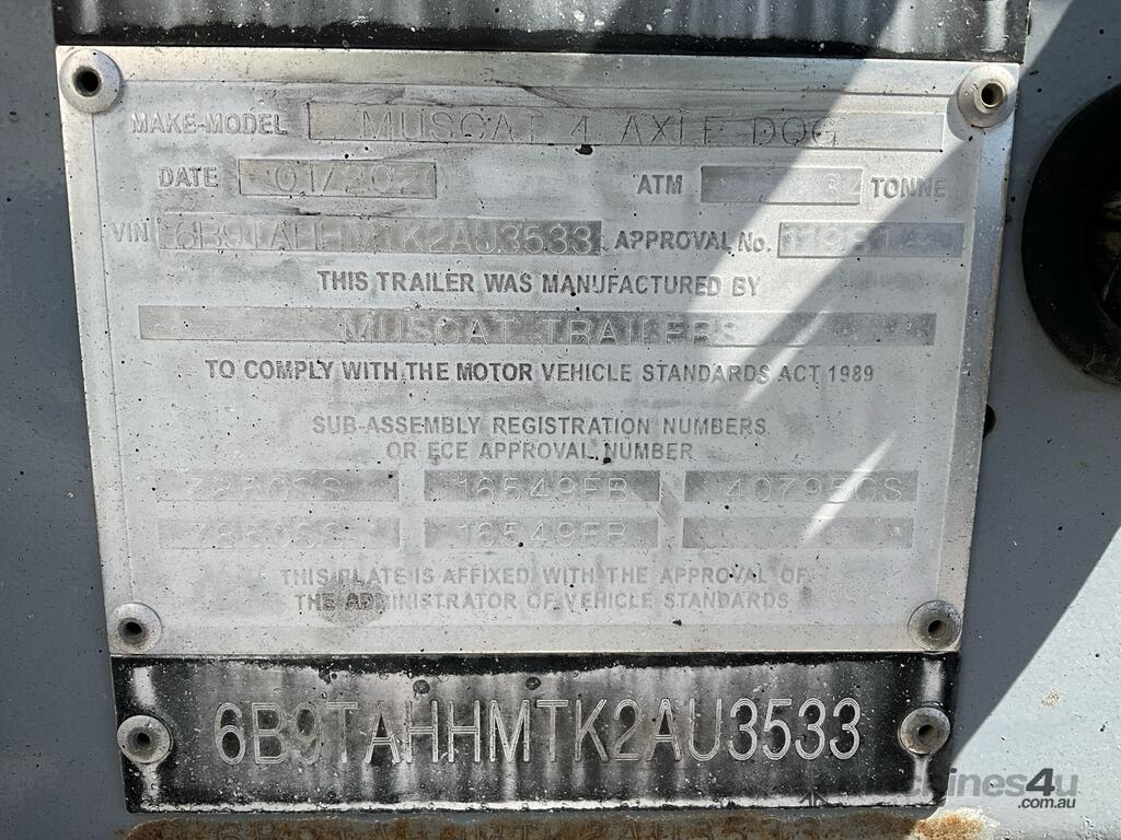 CP: 01/2020,Muscat,4 Axle Dog,Live Bottom Trailer,Hubometer not visible,Colour: Silver,Rego. No: YN29LG NSW,Rego expiry: 15/12/2025,VIN: 6B9TAHHMTK2AU3533,Serial No: 6B9TAHHMTK2AU3533,Sold with No Plates