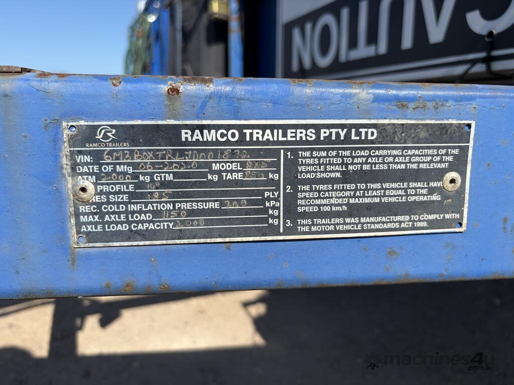 CP: 06/2020,Built: 06/2020,Ramco,8x5 Tandem Axle Plant Trailer,0 (undefined),Colour: Blue,Rego. No: NP(B31355), Unregistered VIC,VIN: 6M3B0XTRLJD001872,Sold with No Plates