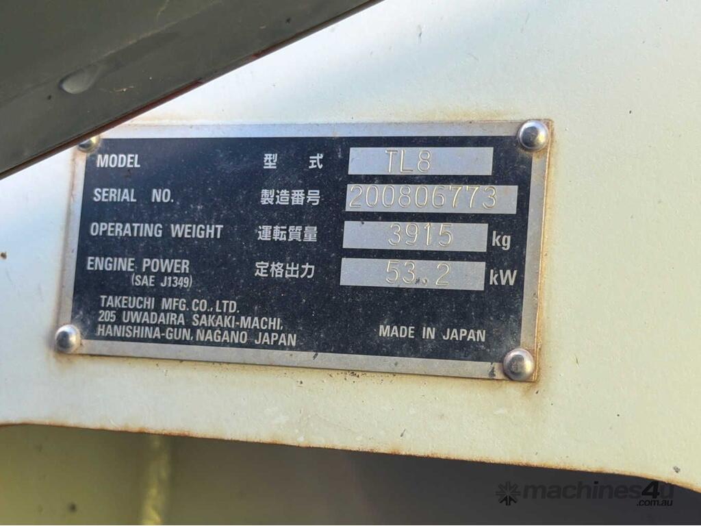 CP: CIRCA 2020,Takeuchi,TL8,Skid Steer (Rubber Tracked),Engine #: 8JE0991,4 Cyl,Diesel Turbo,Odometer not visible,2028 (Hrs. Showing on Hour meter),Colour: Grey,Unregistered,Serial No: ,ROPS No: undefined,FOPS No: undefined,Sold with No Plates,Key No: 474E