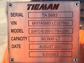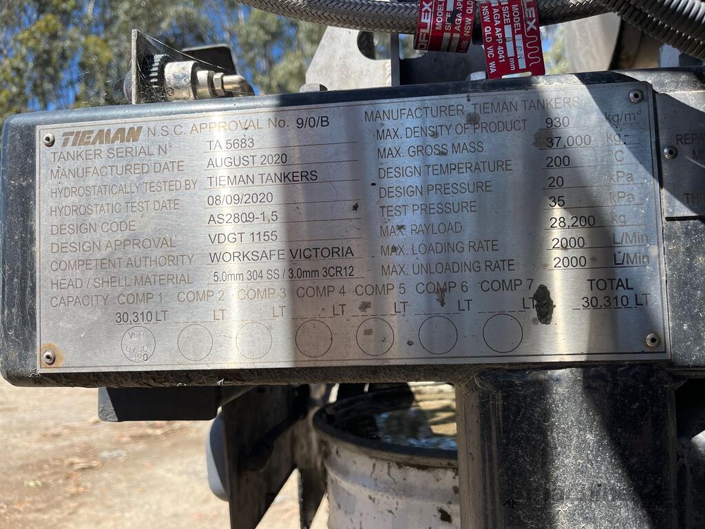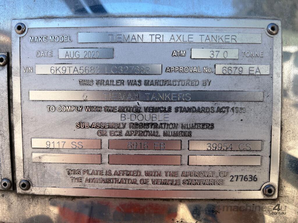 CP: 08/2020,Built: 08/2020,Tieman,Tri Axle Tanker,Tri Axle Bitumen Trailer,Hubometer not visible,Rego. No: NP(YV39HE), Unregistered,VIN: 6K9TA5683LC327683,Sold with No Plates