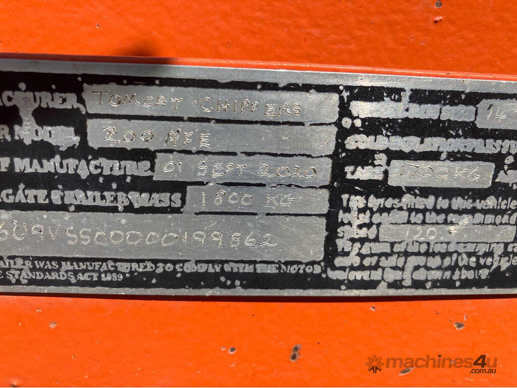 CP: 09/2020,Built: 09/2020,Tomcat Chippers,200AFE,Chipper (Trailer Mount),Engine #: GN65659U,4 Cyl,Diesel,Odometer not visible,404 (Hrs. Showing on Hour meter),Colour: Orange,Rego. No: TH12XL NSW,Rego expiry: 15/09/2026,VIN: 6U9VSS2,Chassis: 6U9VSS2,Serial No: TC34-J0-RSA,Sold with No Plates