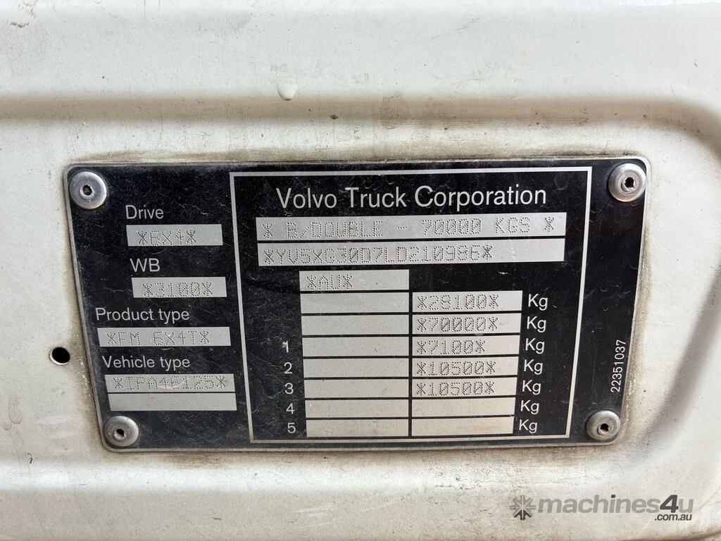 CP: 05/2020,Volvo,FM 500,Prime Mover,Automatic,Airbag,6 Cyl,Diesel,859803 (Kms. Showing on Odometer),Hourmeter not visible,Colour: White,Rego. No: NP(XV39MW), Unregistered NSW,VIN: YV5XG30D7LD210986,Key No: 376,Length: 6820 m,GVM: 28100,GCM: 70000,Sold with No Plates,Key No: 376