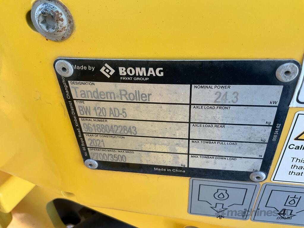 CP: CIRCA 2021,Bomag,BW120AD-5,Smooth Drum Roller,3 Cyl,Diesel,Odometer not visible,350 (Hrs. Showing on Hour meter),Colour: Yellow,Unregistered,Serial No: 43,Sold with No Plates,Key No: 8