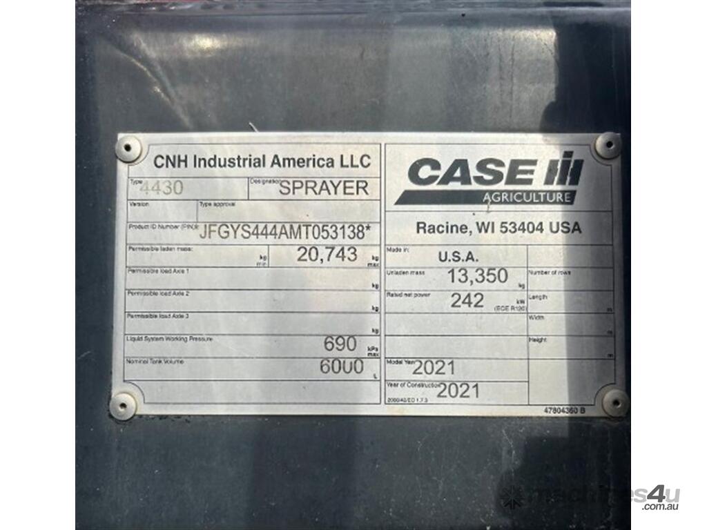 2021 Case IH 4430 Patriot. 2,883 engine hours, 36m Boom, Centre Point RTX Guidance, Aim Command Flex, 620/70 R38 Front and Rear Tyres, Auto Greaser, Front light Bar, Oversize Signs, 60000L Factory Tank. Machine Currently in Moree NSW.