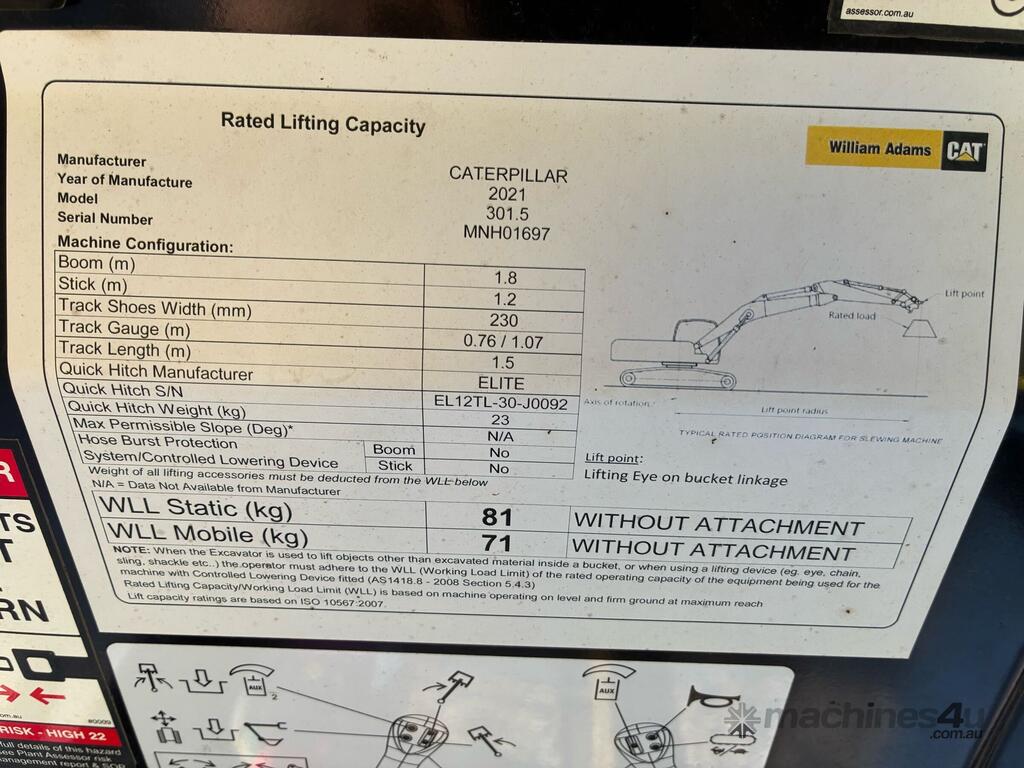 CP: CIRCA 2021,Caterpillar,301.5,Mini Excavator (Rubber Track),3 Cyl,Diesel,Odometer not visible,1370 (Hrs. Showing on Hour meter),Colour: Yellow,Unregistered,VIN: CAT03015KMNH01697,Serial No: MNH01697,ROPS No: ISO 12117-2:2008,Sold with No Plates