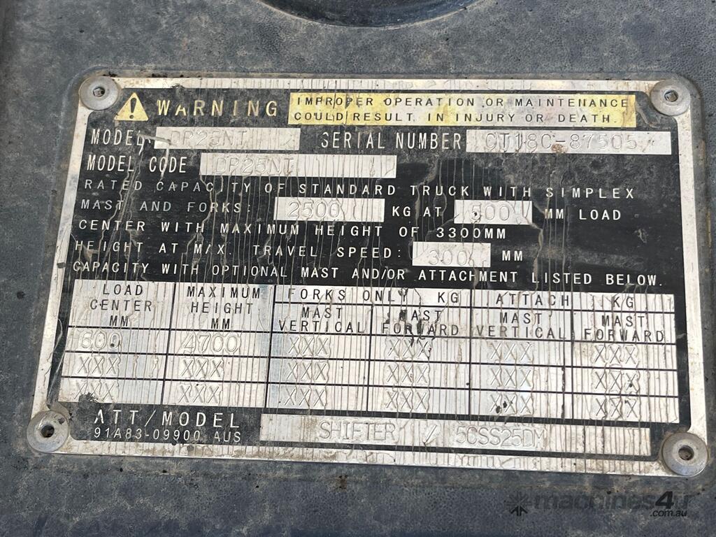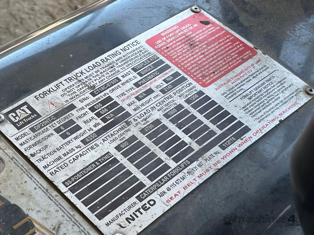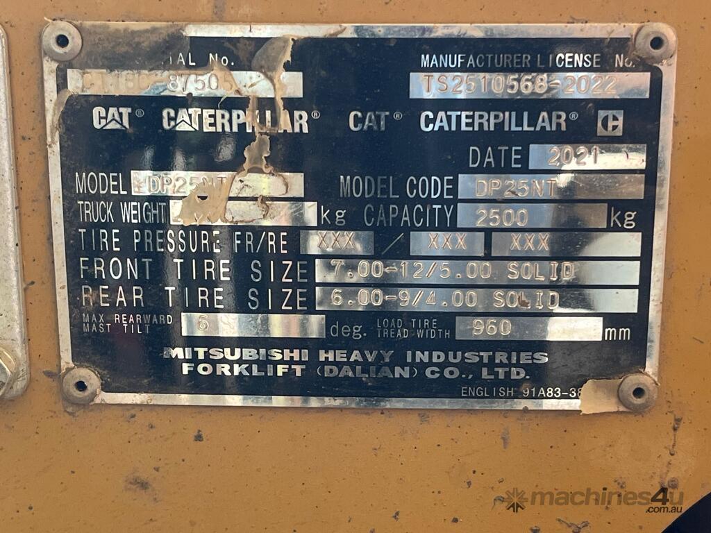 CP: CIRCA 2021,Caterpillar,DP25NT,Forklift,4 Cyl,Diesel,Odometer not visible,1129 (Hrs. Showing on Hour meter),Colour: Yellow,Unregistered,Serial No: CT18C-87505,Sold with No Plates