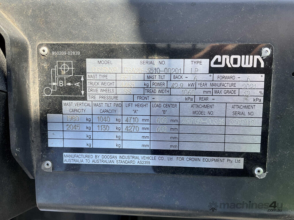 CP: CIRCA 2021,Crown,CG25NXP,Forklift (Counterbalanced),Engine #: 7ML8532,4 Cyl,LPG only,Odometer not visible,424 (Hrs. Showing on Hour meter),Colour: Beige,Unregistered,Serial No: FGA1,ROPS No: undefined,Sold with No Plates,Key No: 414E
