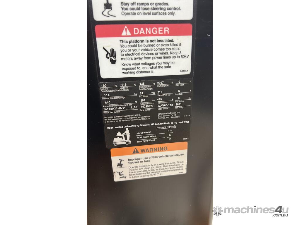 CP: CIRCA 2021,Crown,WAV60-118,Odometer not visible,Hourmeter not visible,Unregistered,Serial No: 10295929,Sold with No Plates