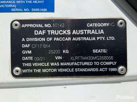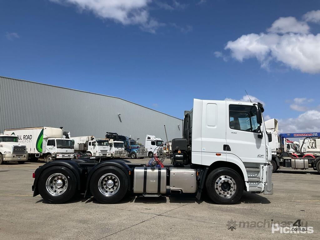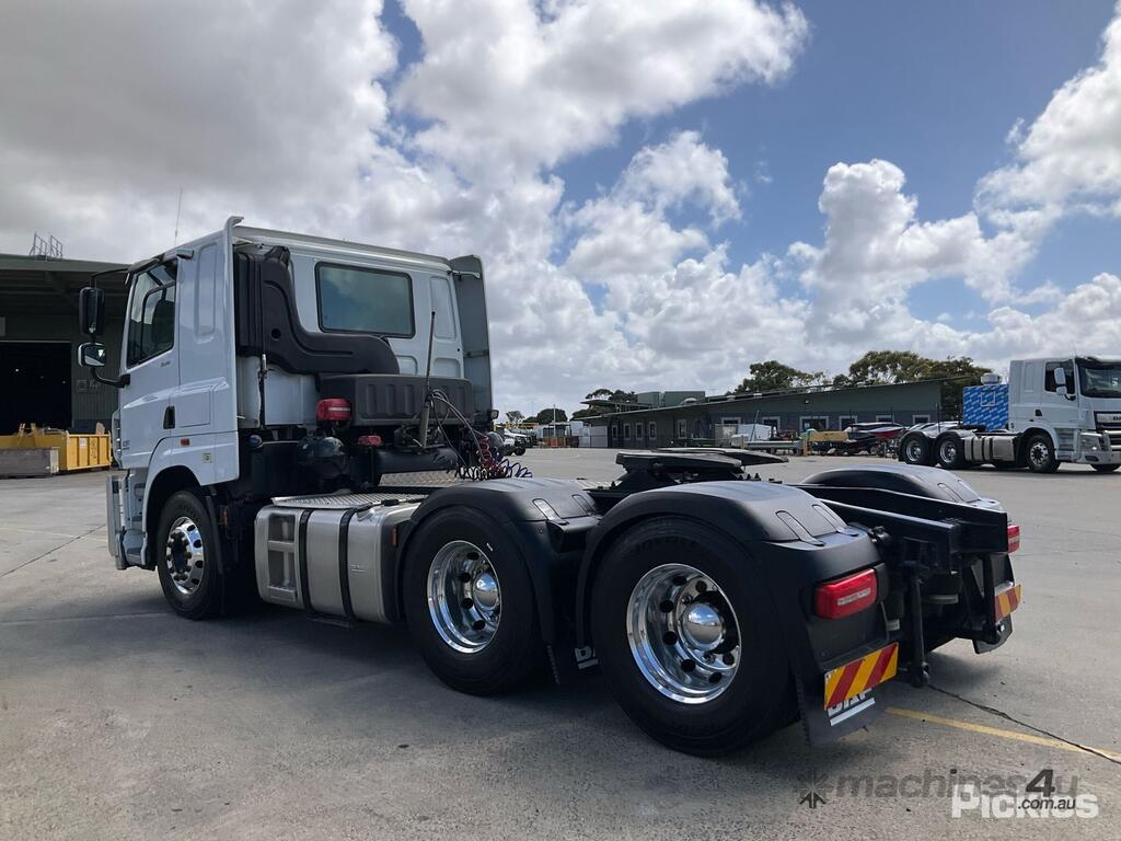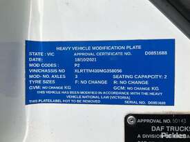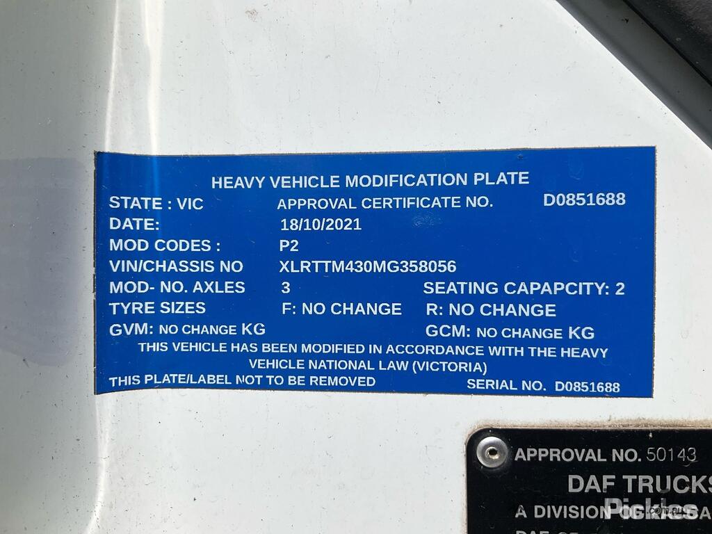 CP: 09/2021,DAF,CF 530,Prime Mover,Automatic,Air Bag Suspension,Paccar,6 Cyl,Diesel,911901 (Kms. Showing on Odometer),Hourmeter not visible,Colour: White,Unregistered,VIN: XLRTTM430MG358056,Key No: 85,GVM: 25200,GCM: 70000,Sold with No Plates,Key No: 85