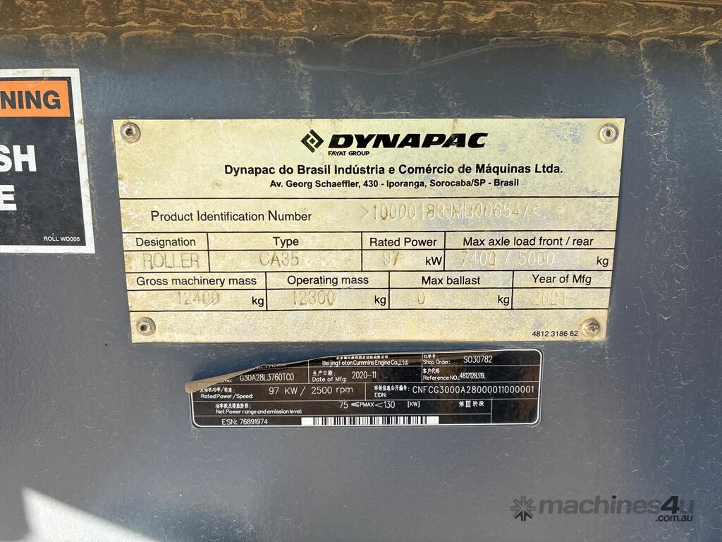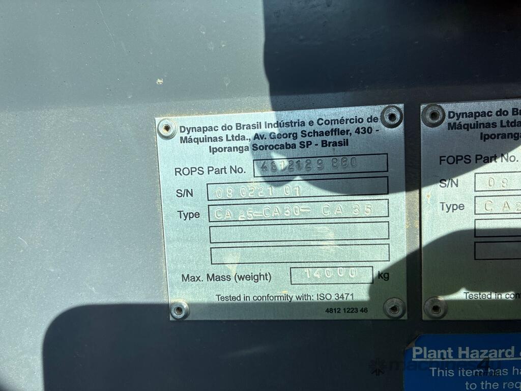 CP: CIRCA 2021,Dynapac,CA35,Roller,Diesel,Odometer not visible,1870 (Hrs. Showing on Hour meter),Colour: White,Rego. No: NP(XV92VG), Unregistered,Serial No: 10000183JMB006547,ROPS No: ,FOPS No: ,Sold with No Plates