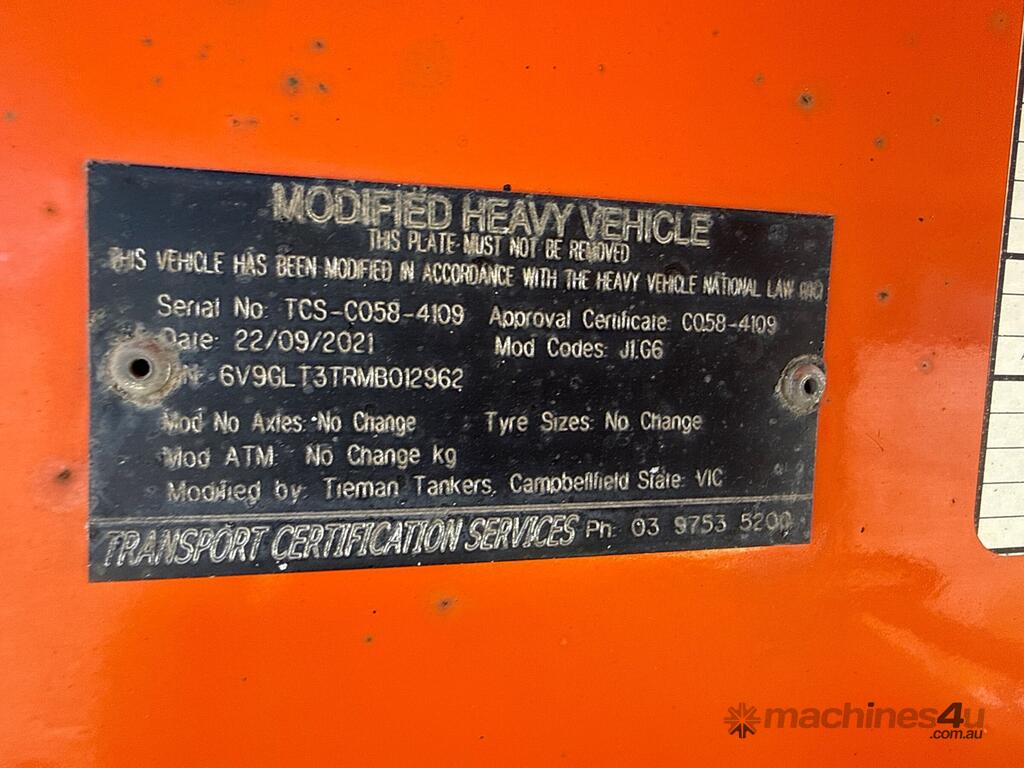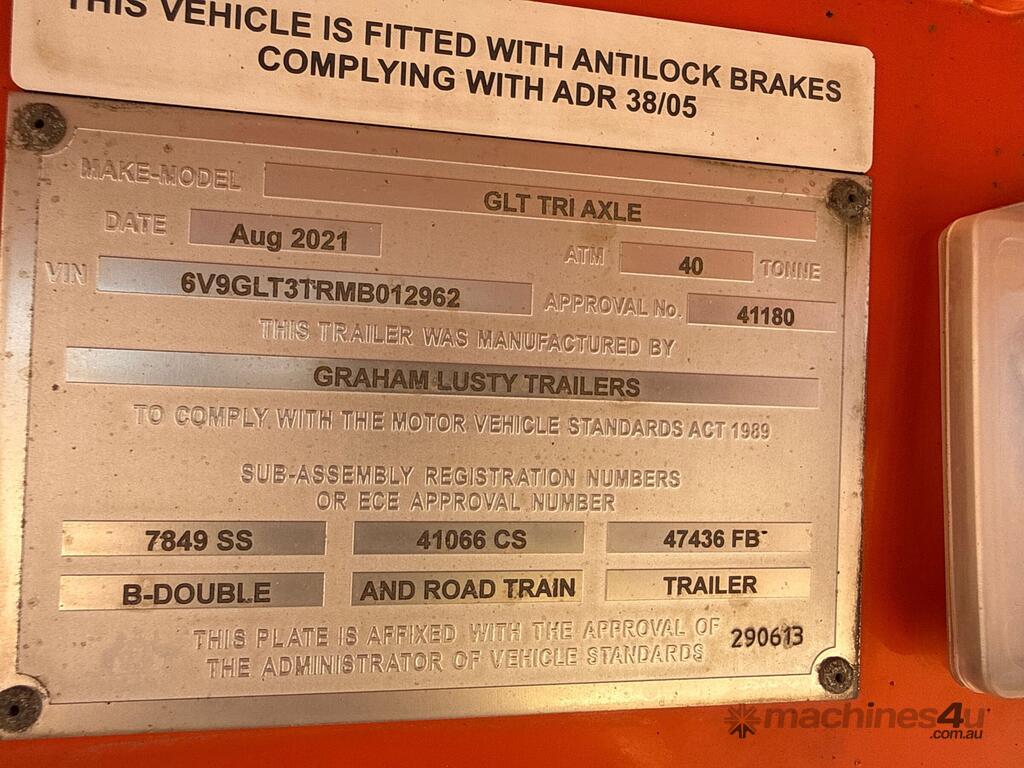 CP: 08/2021,Built: 08/2021,Graham Lusty Trailers,GLT Triaxle,Tri Axle Tanker Trailer,701245 (Kms. Showing on Hubometer),Colour: Orange,Rego. No: YQ12MN NAT,VIN: 6V9GLT3TRMB012962,Sold with No Plates