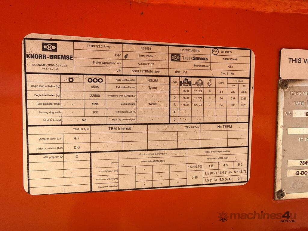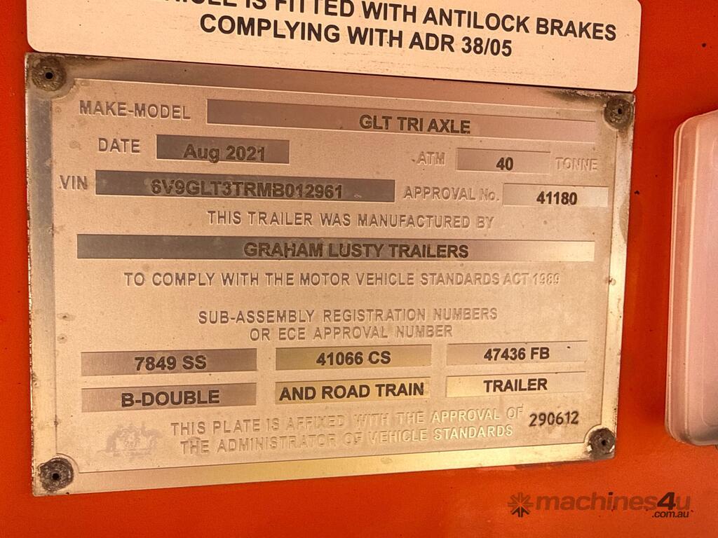 CP: 08/2021,Built: 08/2021,Graham Lusty Trailers,GLT Triaxle,Tri Axle Tanker Trailer,695723 (Kms. Showing on Hubometer),Colour: Orange,Rego. No: YQ10MN NAT,VIN: 6V9GLT3TRMB012961,Sold with No Plates